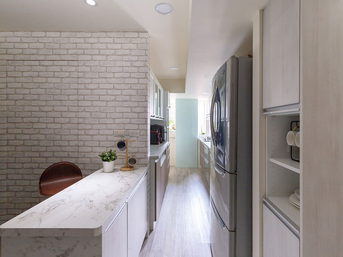 廚房因為選配白色系統櫃,突顯明亮感,深得主人心。往裡看,左側根據電器量身訂製系統櫃,右側的上櫃是現代白色鄉村風烤漆系統櫃,下櫃跳色變化為深木紋系統櫃, 呼應四平八穩與簡潔雅致交融的風貎,往外,比大冰箱還高的白色上下兩段式烤漆系統櫃,分別是置物櫃以及可往外側打開的金屬拉籃,堪稱是歡樂零食倉儲「大怪物」。