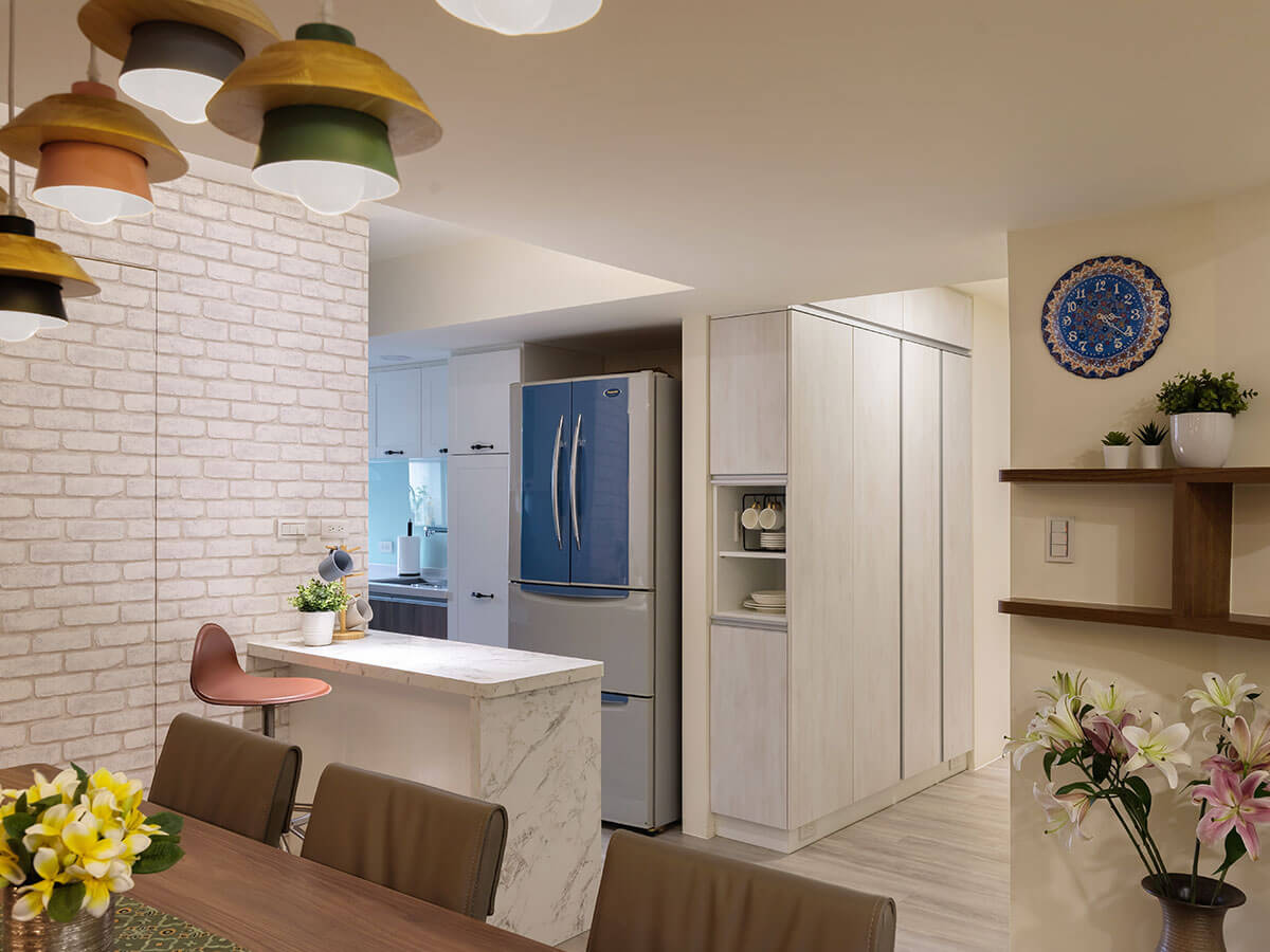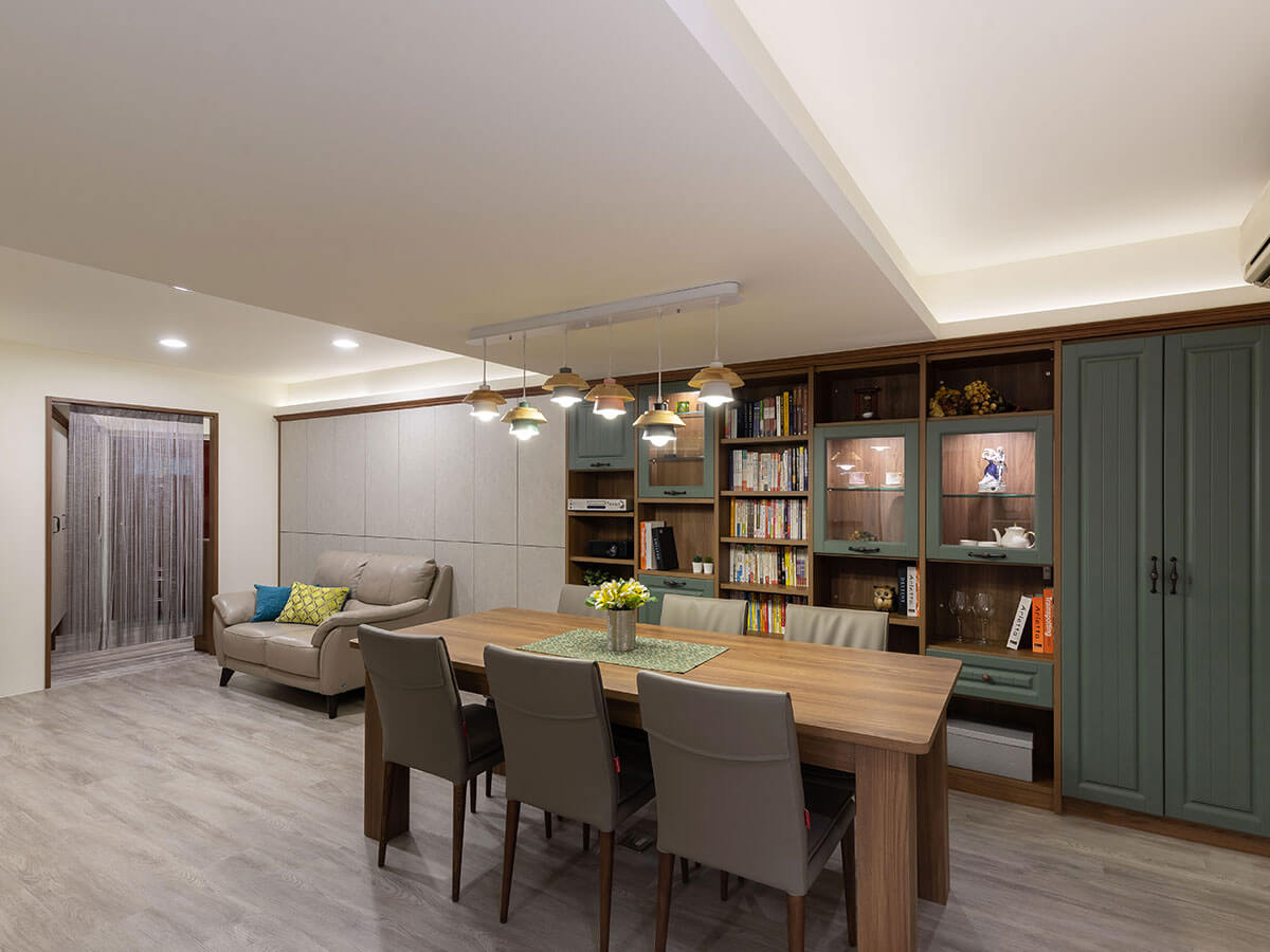 從客廳的開放空間往內延伸,左牆櫃體來到開放空間的餐廳區,接續軍綠色烤漆門片,顯得氣質而典雅、回歸自然的情懷,氣質特出;6人系統板材訂製餐桌是餐廳的焦點,吃飯、聊天,凝聚感情,價值極大化,蔚為全家精神重心。底部牆面實則深不見底,另有奧妙,白色文化石壁面設有暗門,推開就是全家人的書房,依照女主人構想把寢室與書桌區隔開,原來的和室這才重新規劃為書房,專心讀書,放心入睡,歲月靜好。轉進廚房的入口處,長方形中島是母女手玩手作烘培的工作台,仿大理石花色與材質的新銀狐系統板材防火耐磨好擦拭,檯面底下是收納烘焙用具的櫃子,板材櫃門特用隱藏式把手,結實牢靠。