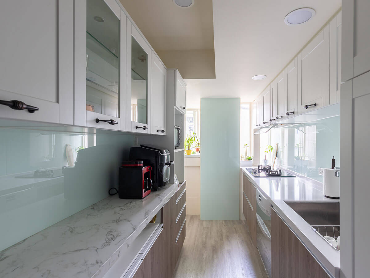 右面是近乎全牆式的鏡面,可供大女兒練舞及全家人著裝照鏡所需,拆掉舊有電視牆,親情不被電視螢幕「綁架」,若要看影片時,只要打開電腦、放下投影布幕,立刻就可變成家庭電影院,不放桌子、保留客廳空間十足寬敞。其實,鏡牆還有個秘密任務,就是把斜的屋角隱藏住了,至於拉直從鏡牆到廚房牆壁的水平線,設計師妙手獻策,在鏡牆臨著走道的廚房入口擺置一組90度兩面可用的柱形置物櫃,達到拉平視野線的功用,正面櫃體上、下都有門,中段中空展示區放置餐盤、吊掛咖啡杯,順手取用很便利,朝向走道的這排4門櫃體儲放空間足夠大。大鏡面左右各有一組迷你展示櫃,分別是純木工手作的「工」字形、「二」字形樣貎,宛如大鏡子的小翅膀,把牆面點綴得舞動起來。