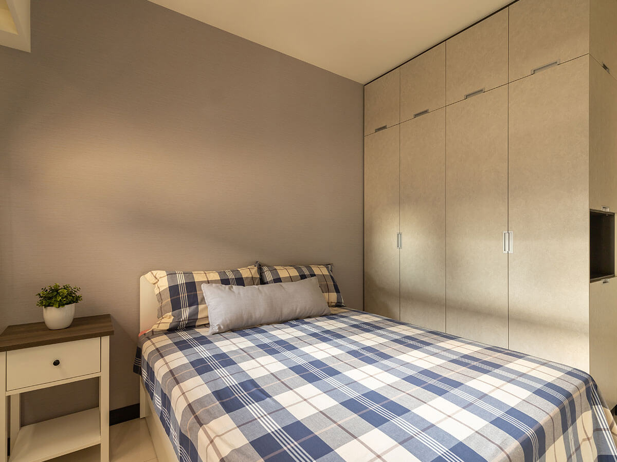 次臥房床後牆面,選用褐金色摻雜著細小銀點的布紋壁紙,素雅卻不凡;客臥房背牆壁紙稍有區隔,灰色布紋更顯素樸穩健。