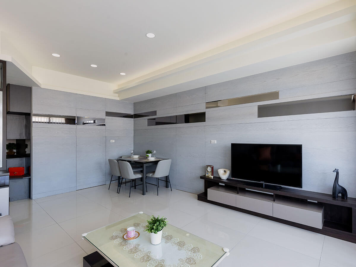 蔣妮恩表示,客餐廳四面貼牆式的大片灰紋板材,是把天然木皮紋路染成淺灰色,一氣呵成,宛如全開畫作,上方搭配鏡面,反射空間肚大能容,開放式客餐廳因而形成獨具韻味的整體性牆面,甚至在廚房口、通往房間的走道口也加裝同款門片,閤起門來,房間保有隱密性,女主人可在客廳盡情高歌。
