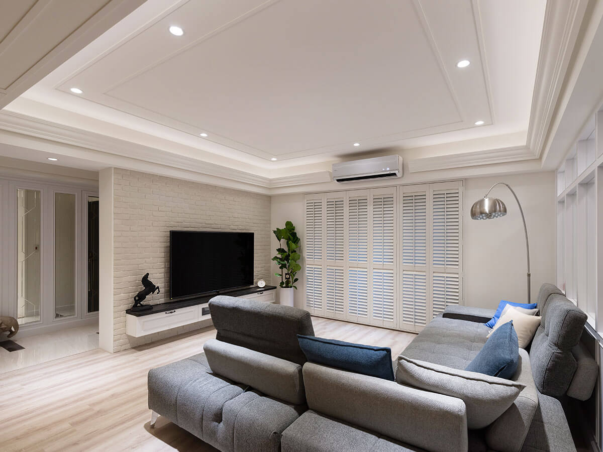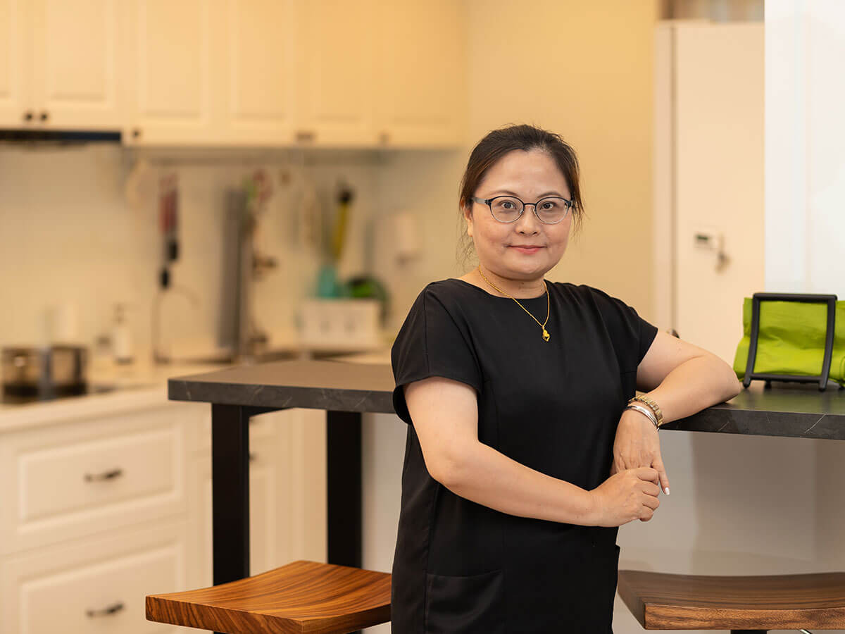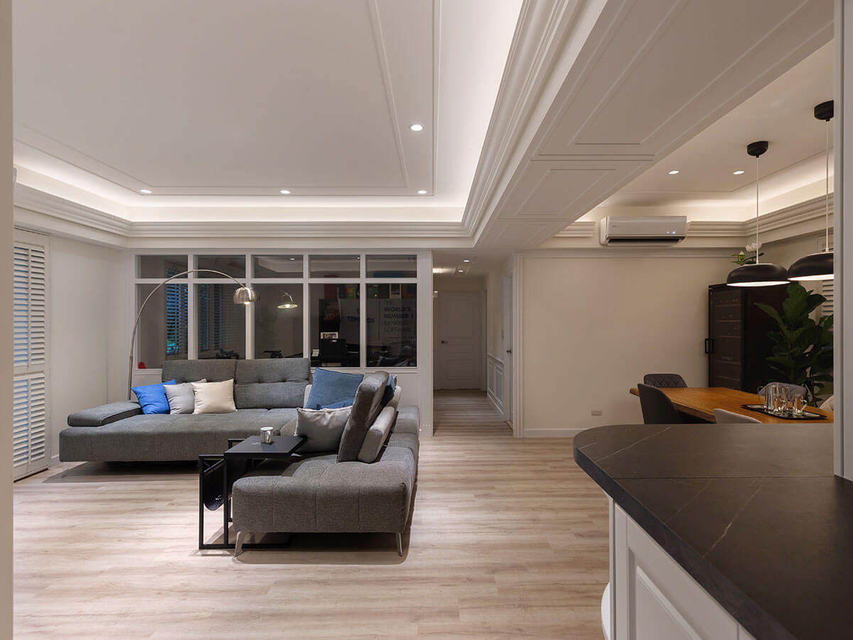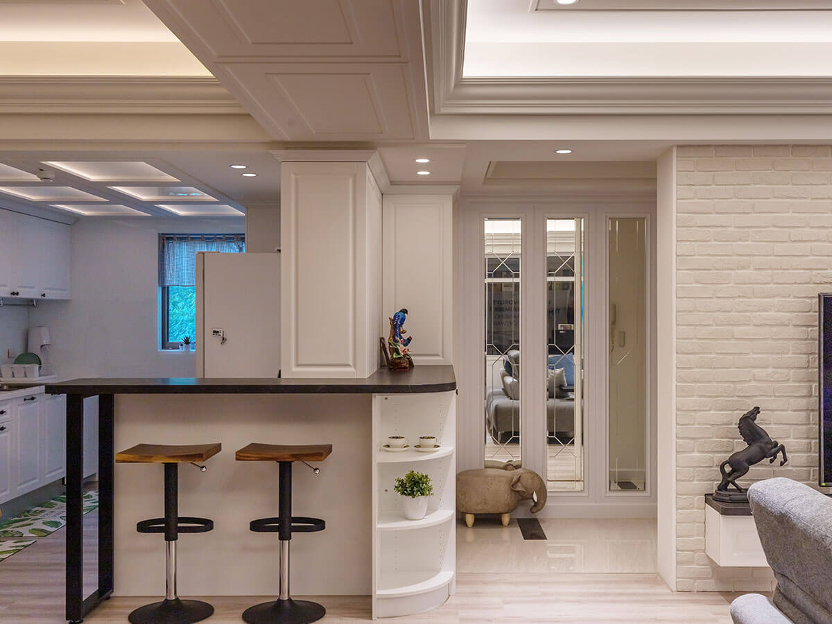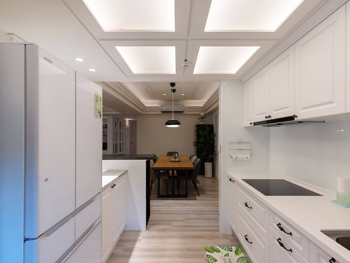 「哥哥就是請『綠的傢俱』承辦設計裝潢,非常滿意,所以我和先生率先考慮『綠的傢俱』。」溝通後發現系統規劃設計師李玫樺及理想家設計師翁翊濰的團隊協力合作,很契合夫妻倆的理念與需求,就正式動工了。完美的作品,看大局,也觀察細節。以白色為底的鄉村風把公寓變得煥然一新,簡約大器又耐看,突顯了男女主角高階且時尚的身分地位;在細緻之處,廚房量身製作收納櫃位的人性化設計、使用電熱爐取代瓦斯的無油煙環境,使原本就愛做菜的女主人更能輕鬆表現手藝,廚房與主臥室的橫樑都獲得貼心包覆卻又不占用收納空間,視野淨空,男主人從室內望向窗外的中庭綠園:「行住坐臥都清爽明朗,每個早晨在鳥兒歌聲中醒來,生活就該是這麼美好。」