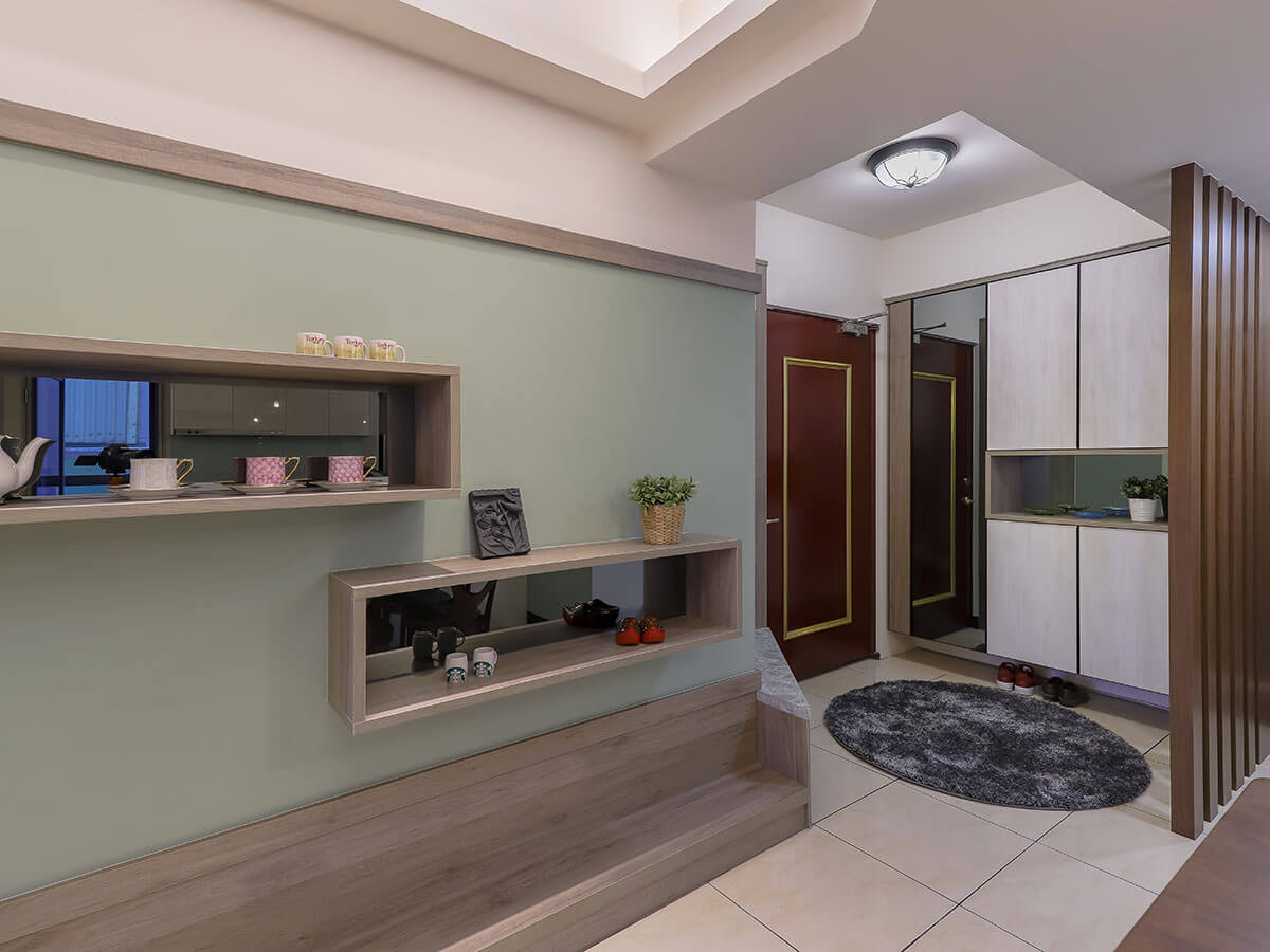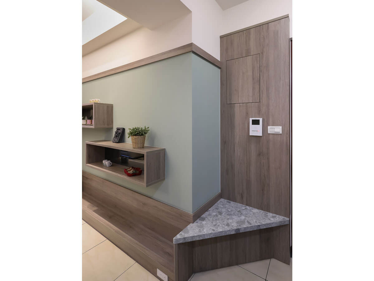 進得門來,首先看到的是左側的衣鞋、雜物收納櫃和全面穿衣鏡,柵欄狀玄關型塑與餐桌區的裡外之分,右手邊仿大理石紋路、材質的三角形座位可供穿脫鞋襪,匠心獨運製作的背板牆面其實是把電路箱遮住不礙眼,接續下來,客廳和餐桌區的主牆面,都使用莫蘭迪綠的藝術漆壁,讓人似乎走進早春的意境裡,嵌在牆上的上左、下右兩個長方框架,連同靠近地面的L型貼牆長木台,全都是展示品的表演舞台。