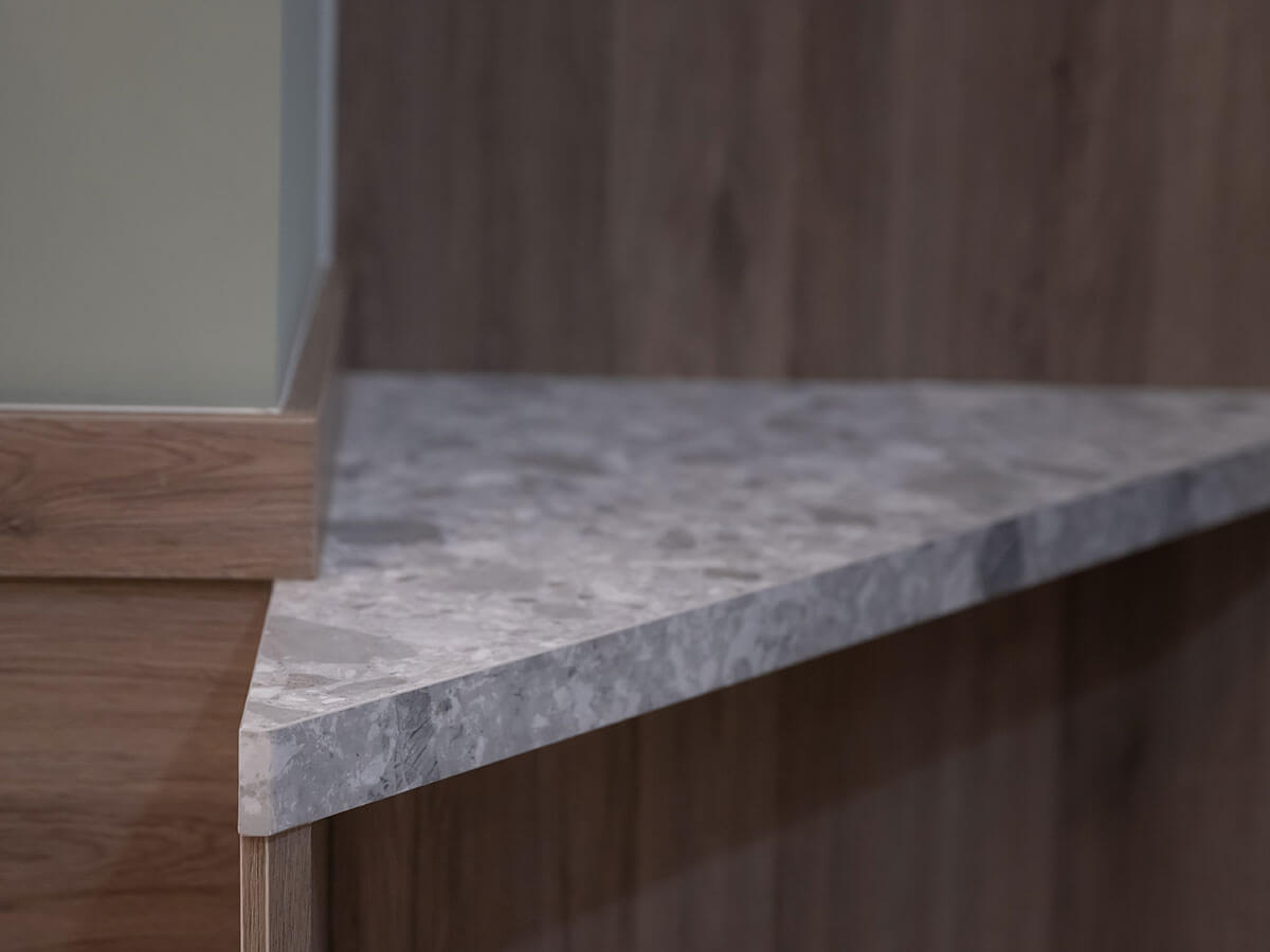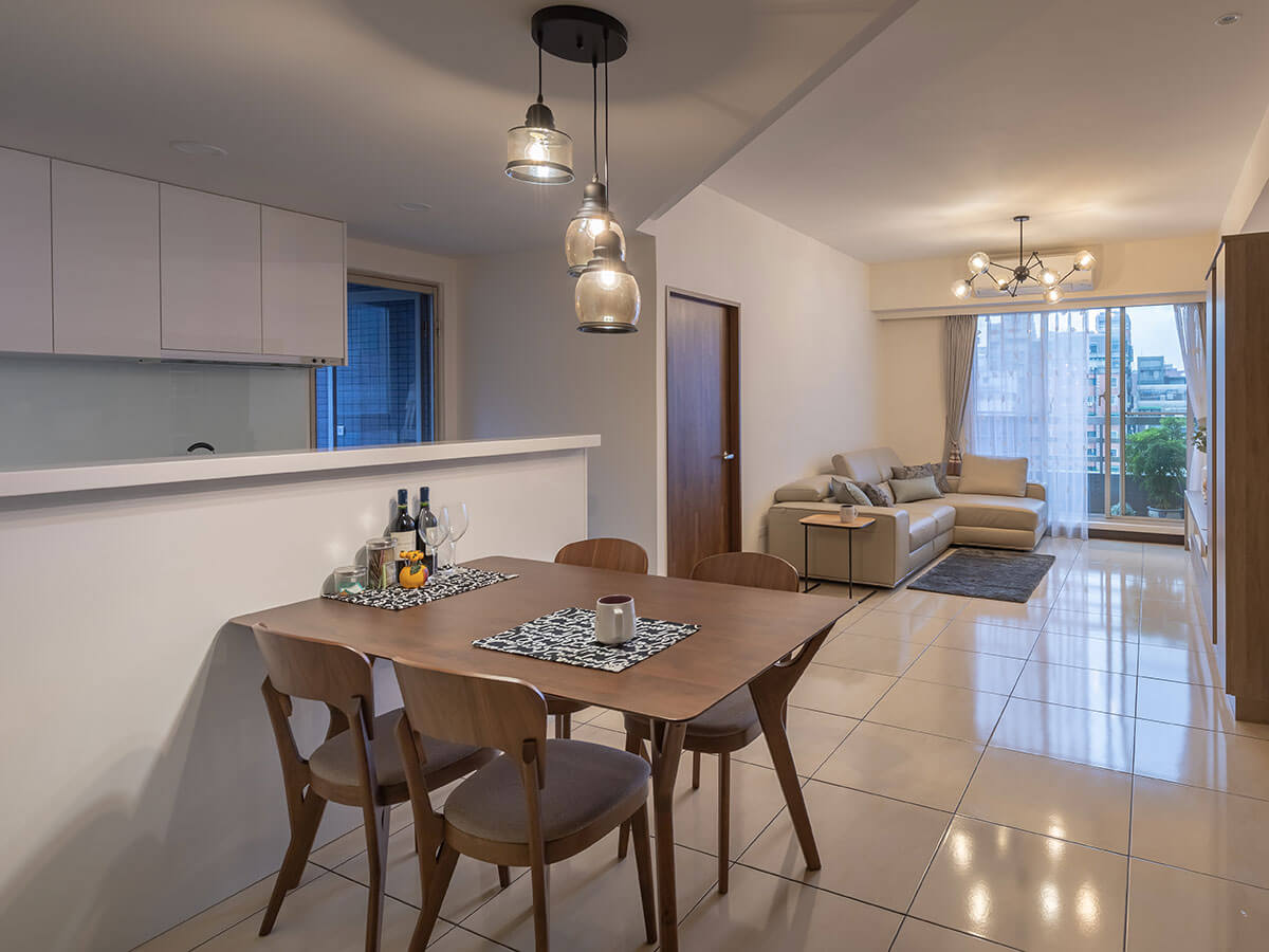 兩位設計師表示,客廳上方往餐桌區延伸形成一氣呵成的開放空間,獨特斜角造型天花板散發流線的寫意,他把餐桌區和廚房中間的隔牆打掉,改做為中島平台櫃,可以充當吧台,多了一分休憩的情趣,人造石的烤漆台面堅固卻輕巧,耐用又很容易清理,地上使用防滑磚,即便滴水在地,安全照樣有保障。