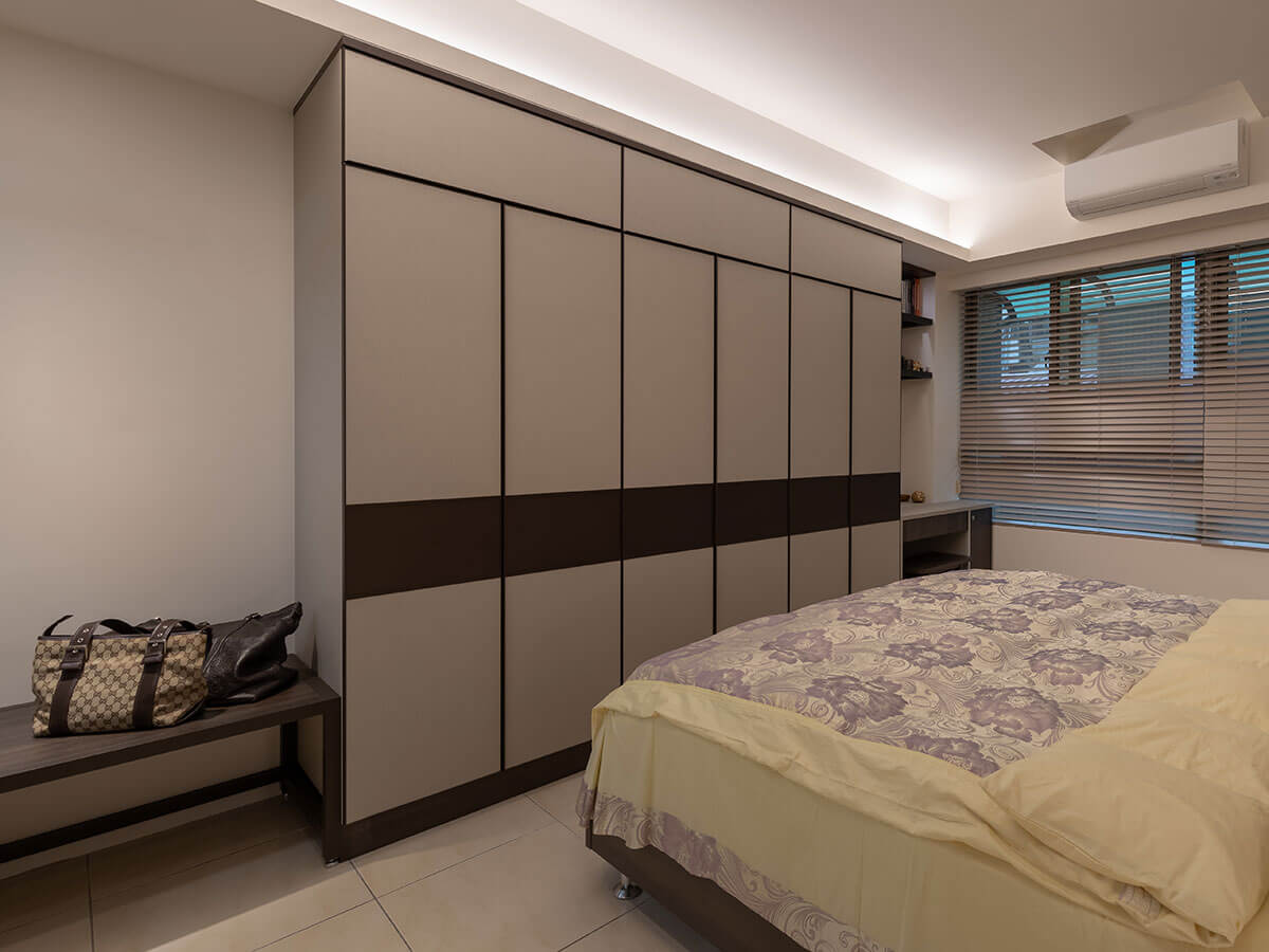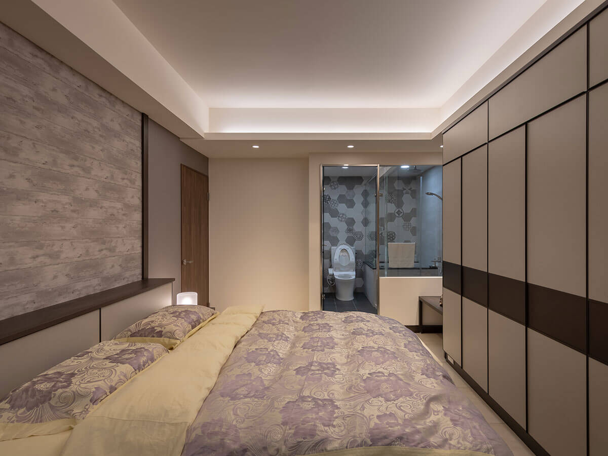 主臥室浴室一如飯店等級設備,貴氣皮革、溫潤布紋形成收納衣櫃的門面二重唱,周家偉利用衣櫃兩側、轉角樑下空間布置ㄇ型平直木面鐵架和梳妝台、展示功能收納架,小空間、向上空間充分運用的結果,讓整理機制達到最高滿足點,尤其精準測量的寬面長椅正適合迎接剛進家門的主人攤開皮箱作整理,等同五星飯店房間的標準配備,床頭櫃上方壁面是獨一無二的木紋圖案,宛如歐式的渲染織錦,在安適情懷當下,還加添觀賞價值。