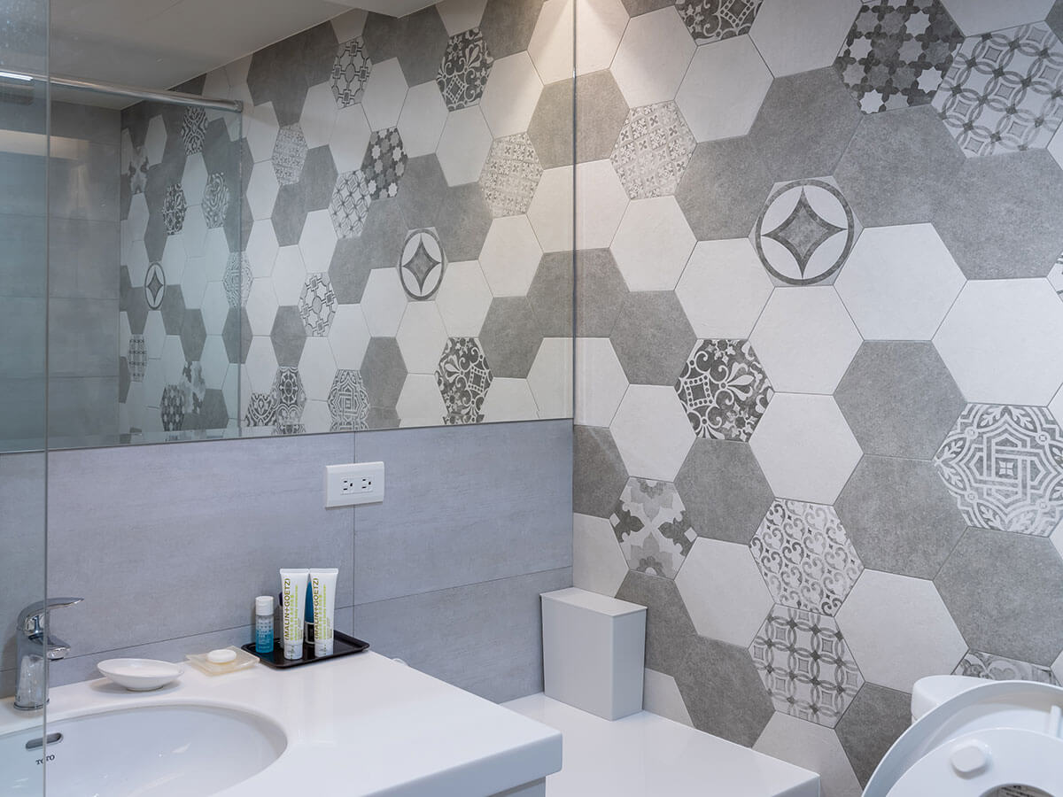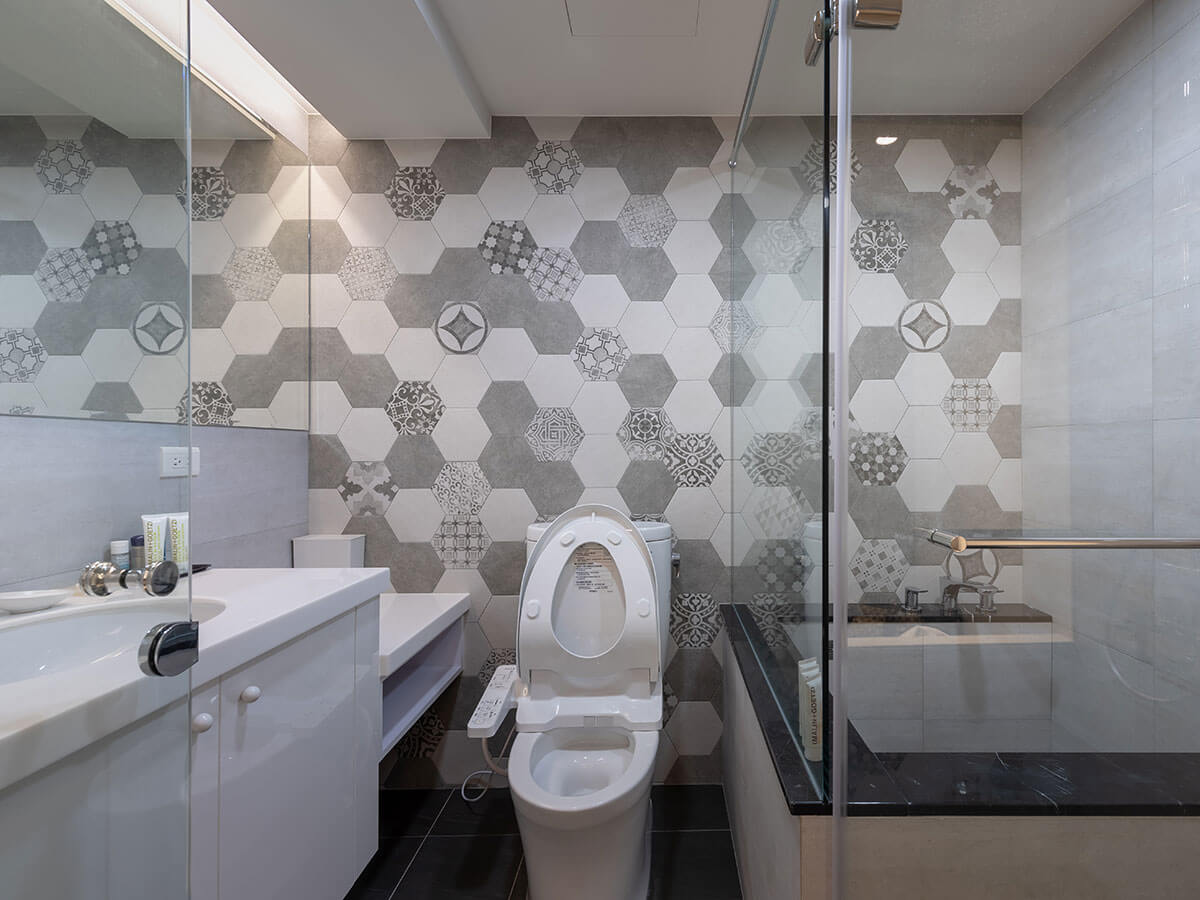 浴廁設計的透明玻璃門裡頭,淋浴間推門正好略低於蓮蓬頭掛立高度而能巧妙闔上,乾溼分離效果好,連同地上的網式流水孔,自然而然予人清爽、便利感,歷久猶新,最特別是的周家偉、蔣妮恩就地拚合六角形花磚而做成獨特創意壁圖的牆面,延續全屋幾何美感的主軸,就像一幅永遠看不膩的風景。