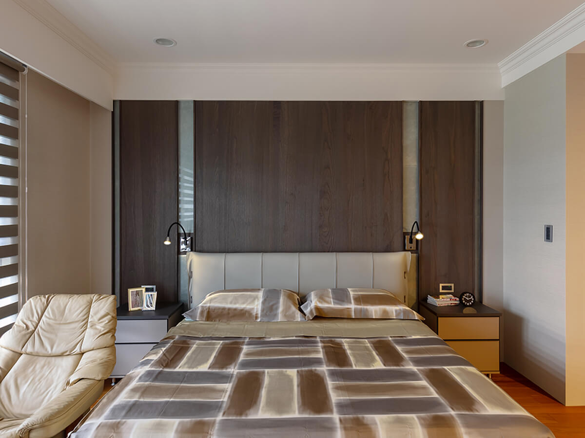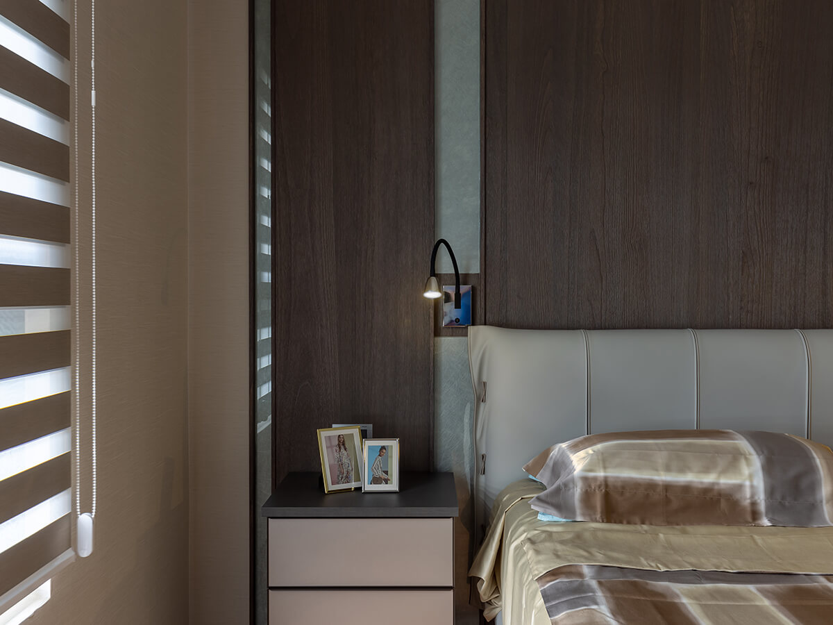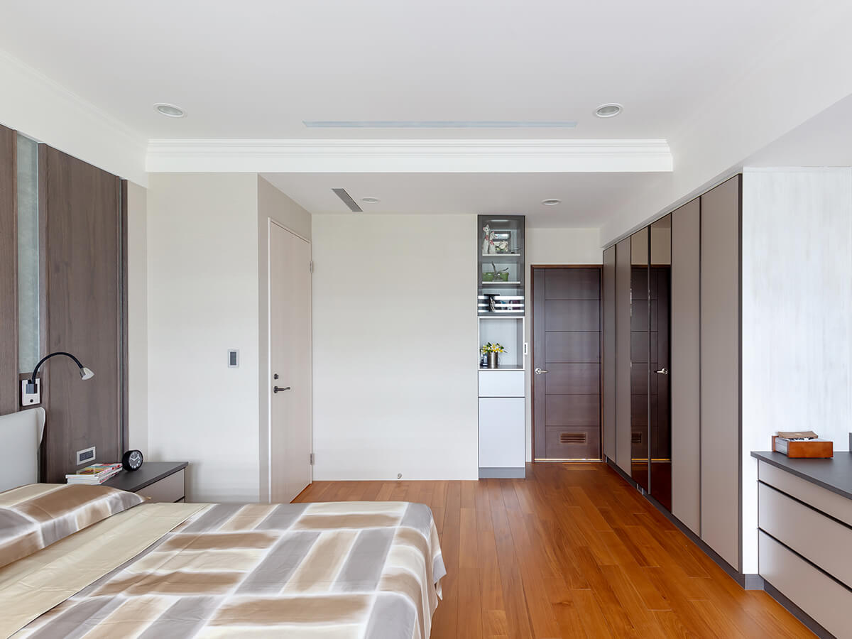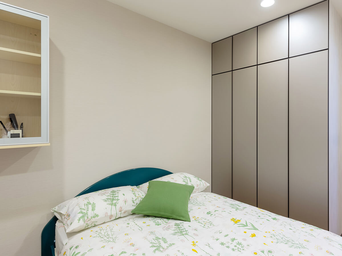 除了餐桌檯面降低,打開「綠的傢俱」系統衣櫃,衣桿高度同樣也為女主人調低,使用系統櫃收納時一點也不費力。環顧主臥室,還有另一隱藏亮點,那就是插座位置不在彎身才能搆到的牆底,改設在一伸手就可觸及的牆面中間,這也是設計師為屋主考量的貼心。