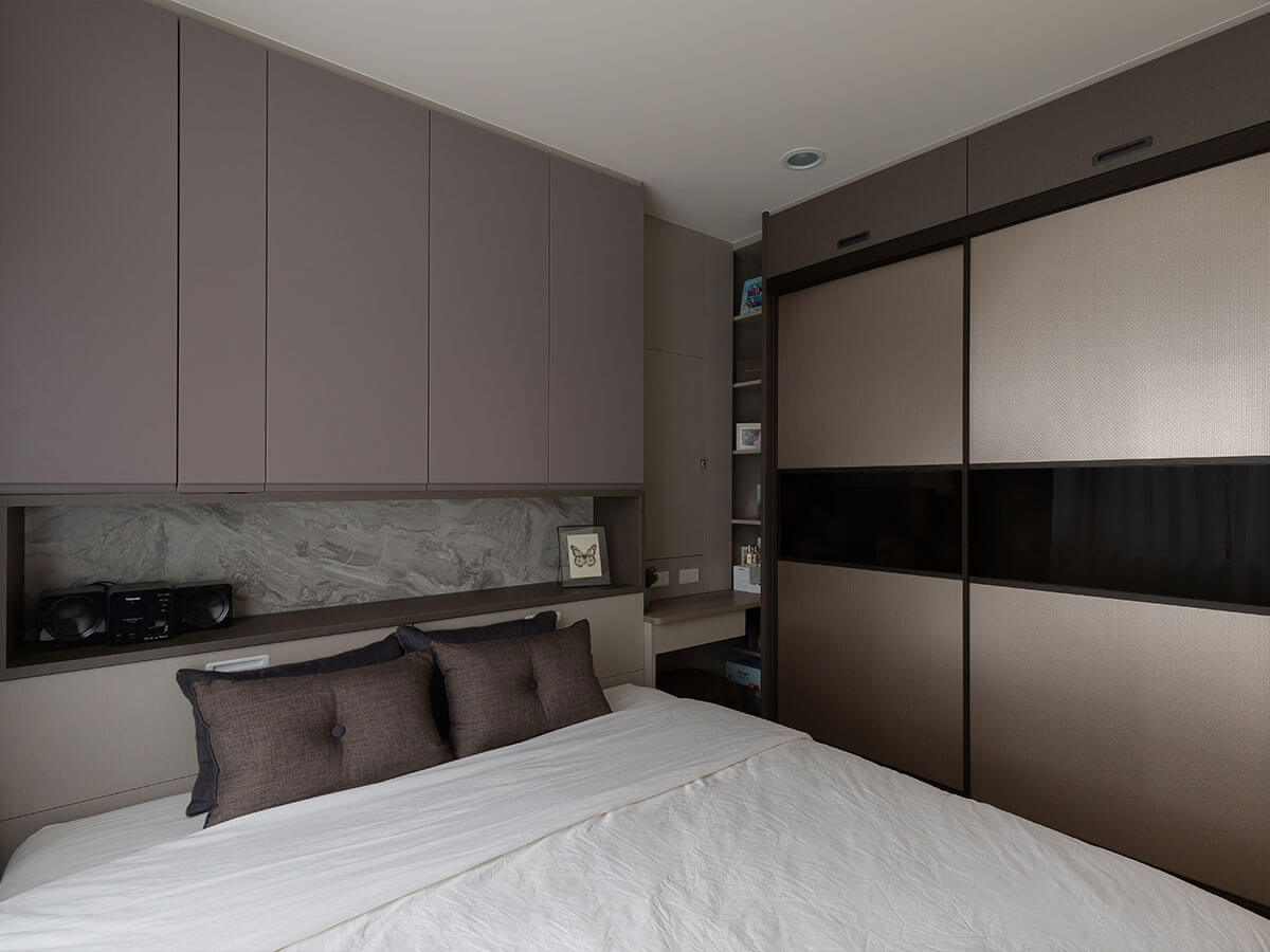 主臥室的系統櫃配置,精確到位,一進門右側有女主人衣物櫃、左側有男主人衣物櫃,此外還有床頭櫃,都以淺色系為主,清爽簡約,床頭灰紫霧滑面陶烤,映照木紋地板,散發低調奢華質感。