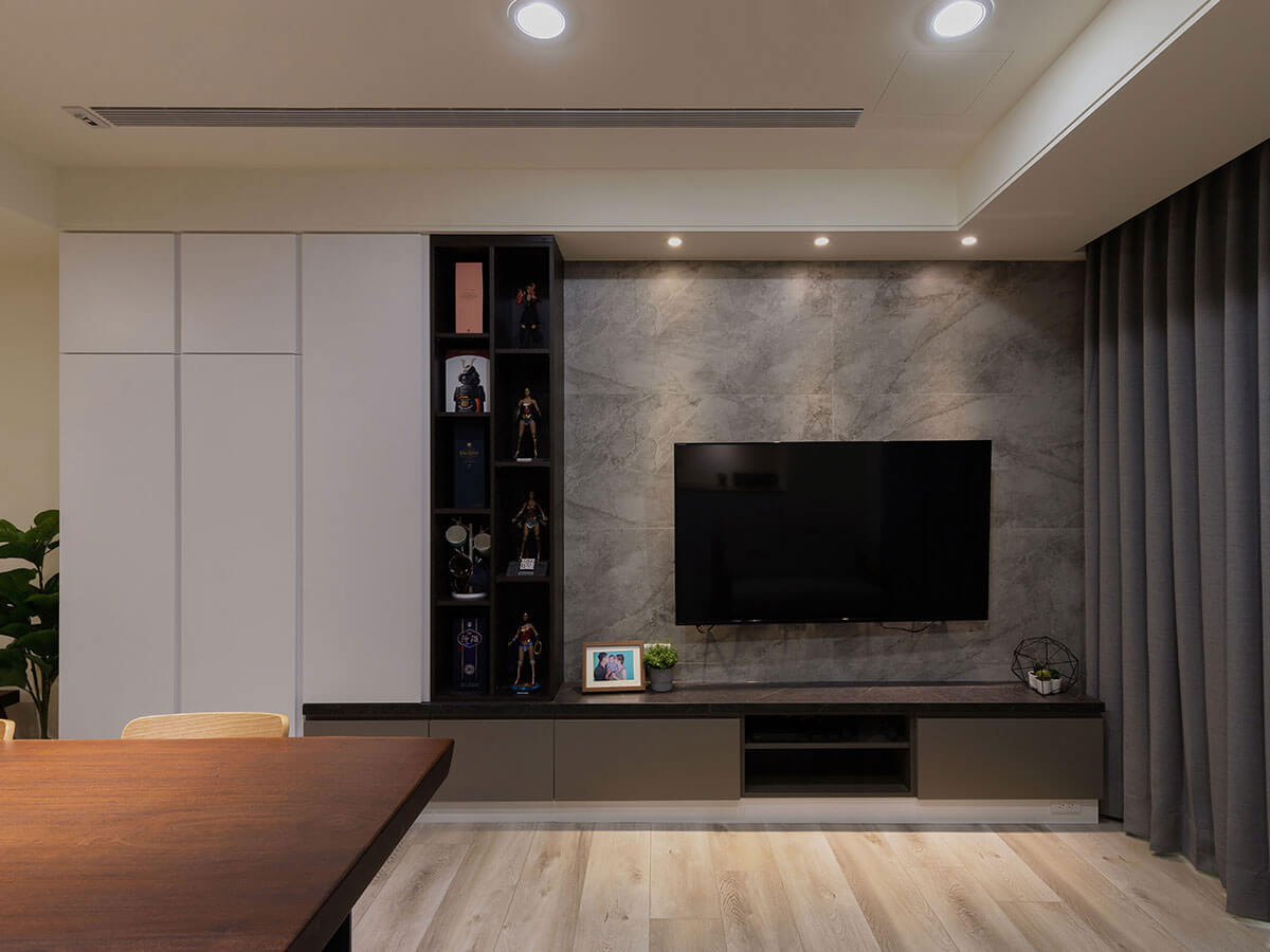 主人偏好大理石紋,電視牆就採用帕雷格石紋磁磚,相當好清理,電視旁是公仔展示櫃,下方是置物櫃,順手收,東西全找得到;旁邊的陶瓷烤漆白色收納櫃,專門放置男主人的鞋子與外出外套,貼心的活動拉桿配件,往外拉時掛取外套,回收時則關上門,靈活好用。