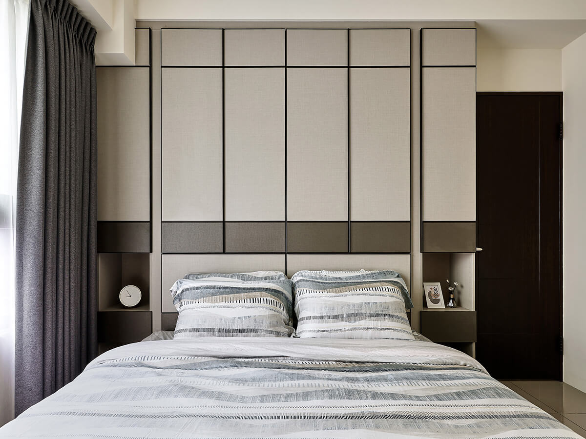 走進主臥,絲毫不見樑柱的蹤影,理想家設計師巧妙地將其完整包覆,與櫥櫃連成一體,內縮的衣櫃,一路綿延到柱體的位置,無落差的設計,沒有多餘的樑柱帶來視覺負擔。櫥櫃的壁面利用線條的堆疊,勾勒出層次,讓素淨的色調頓時活潑起來。櫃門以亞麻灰搭配咖啡色鋁條把手,鈦絲褐的板材則為衣櫃的上下增加了色彩變化。床頭櫃門下方,則是下掀式收納櫃,大型顯重的衣物可以輕鬆置放,完全不浪費任何收納的空間。座落在床頭左右兩側的崁燈,是閱讀時刻最親密的夥伴,適時提供需要的光源與舒適。「綠的傢俱」特色十足的豐饒金插座框,更為整座櫥櫃增添些許珍貴感。
