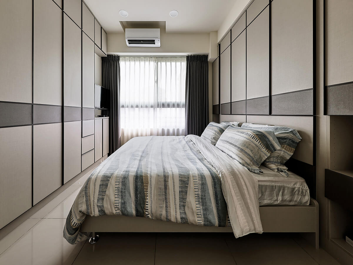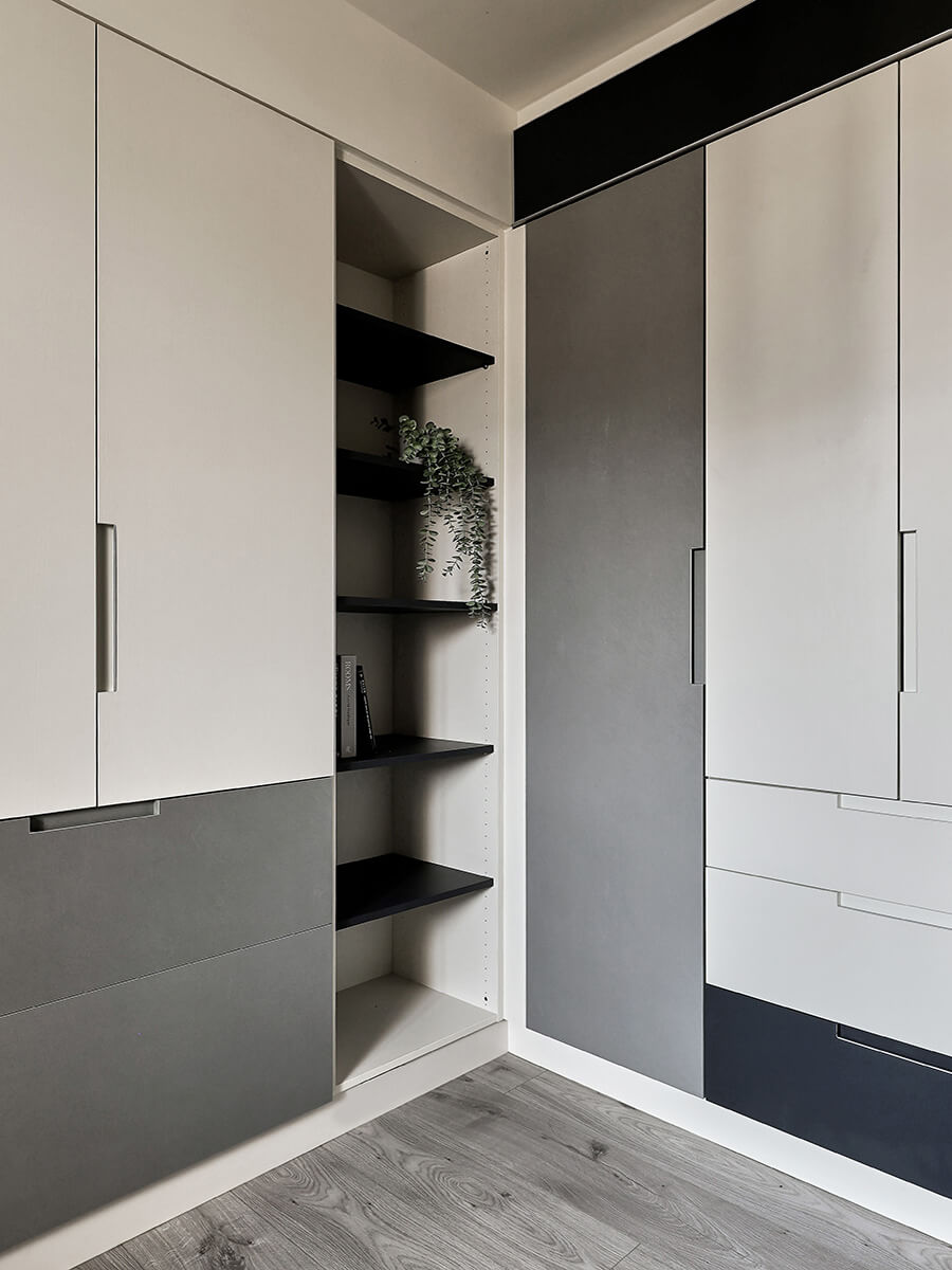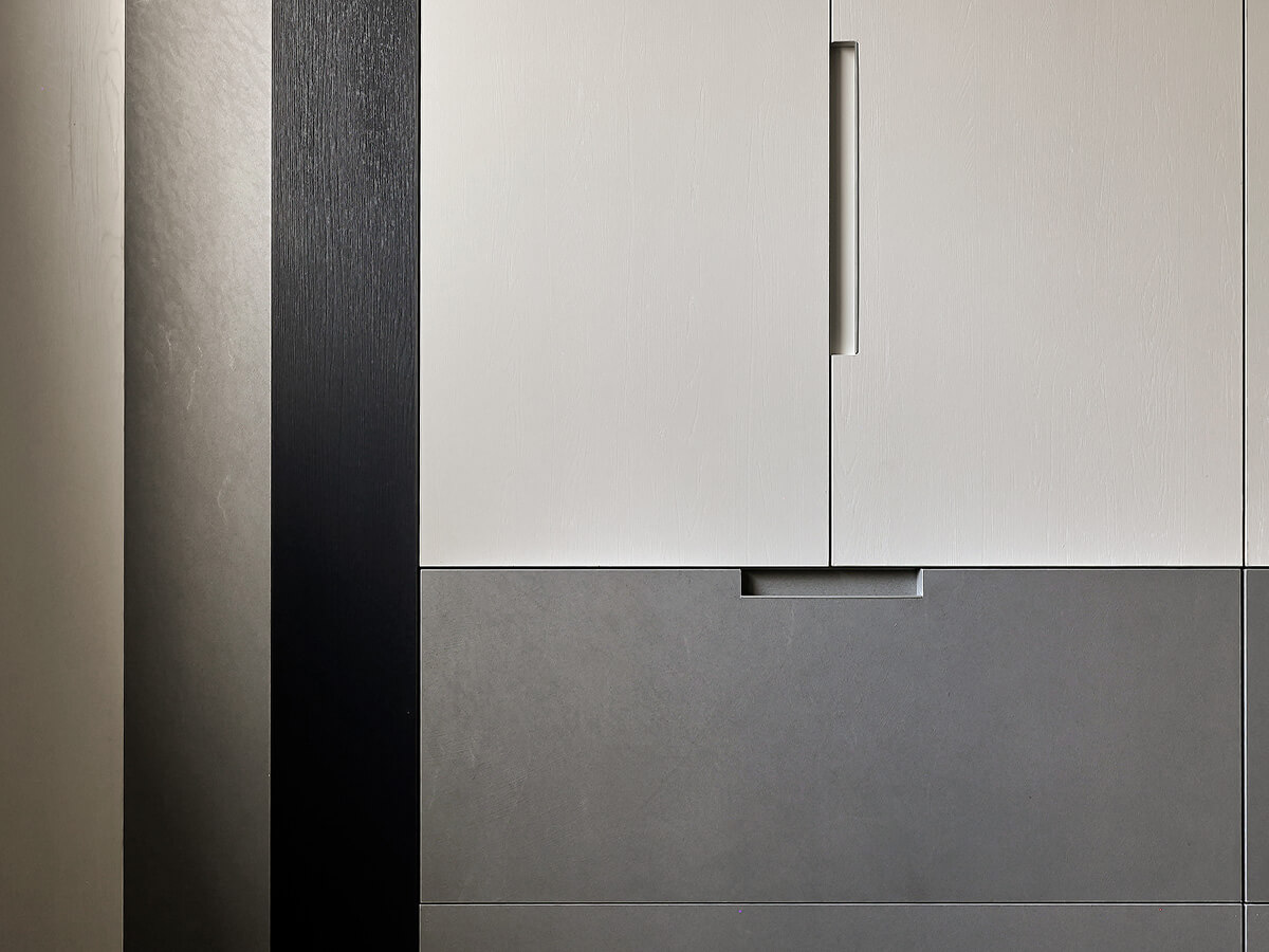 架高的木地板是這間臥室的地板規劃,放上兩張單人床,就是完美的女兒房。沿著壁面的櫥櫃還有小小心思,上掀門拉開,可完整置放兩套被褥,收納毫無困難。衣櫃臨窗位置原有的樑柱,系統櫃設計師先以白色鑼帛包覆且拉齊,隱藏在牆面的設計中,不落痕跡。在與衣櫃連接處,先以岩灰與暗黑板材讓空間產生漸層效果,讓視覺依序前進。衣櫃上半部以鑼帛作為用色主體,下半部則輔以岩灰來收尾。另一邊垂直的櫥櫃,先以滿版岩灰作為櫃門,緊接著鑼帛與暗黑分別為櫃門跟抽屜妝點色彩。整體室內的色調在鑼帛、岩灰、暗黑的交錯下協奏著。而櫥櫃的尚約門把手,體貼使用者的便利性,客製著最適合的深淺及長寬。