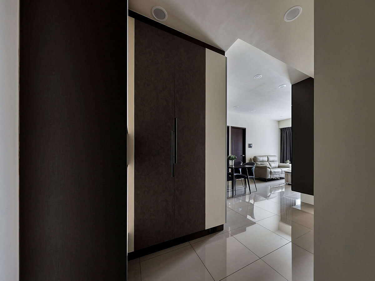 開啟大門,沿著視線右側望去,映入眼簾的,是雲彩白鋪墊的貼壁灰鏡,以咖啡色鋁條把手包框,而貼壁鏡下方崁燈的和煦光源,帶來一絲溫暖氣息。左側鑼帛構置的櫃門,是「綠的傢俱」的獨家板材。儲藏櫃上下櫃門以不同的高度打造層次感,中間簍空位置,些許居家小物輕輕緩和了視覺。櫃門落地處,綿延的鈦絲褐踢腳板,成了與雲彩石地板橋接的緩衝。沿著視線望去,與儲藏櫃垂直而立的鞋櫃,皮革灰的嶄新板材,用來撐起櫥櫃扮演的收納角色,搭配左低右高的尚約門把手,層次分明。