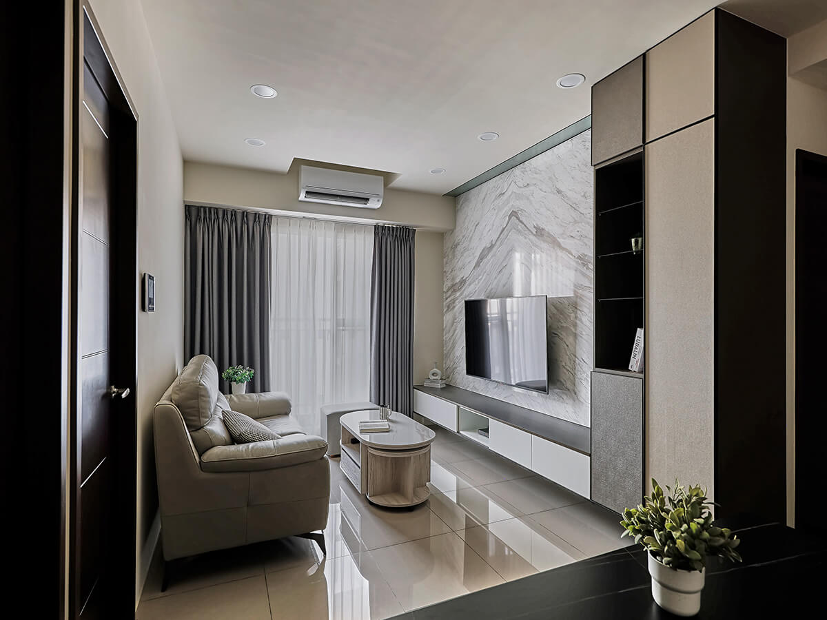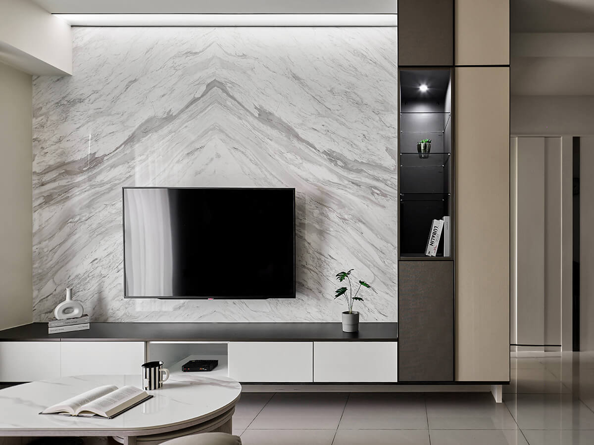 客廳的視覺,由紋路分明、絢麗清晰的大理石牆面展開視野,恍如一座靈山,雲霧裊繞,這還是屋主陳先生依著理想家設計師提供的設計圖親自尋獲的石材,並請專人切割成形融入客廳的整體設計,獨一無二,洗鍊孜意,卻又變化萬千。