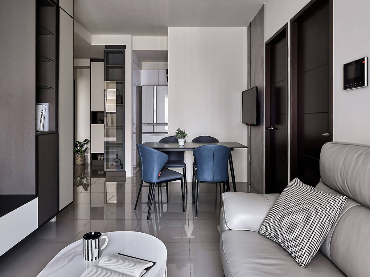 與客廳緊鄰的餐廳區,以勞倫黑金板岩的餐桌為餐廳奠定基調,天然石粉與長英石高溫燒製的板岩,透過菱形切割的桌面勾勒出造型,有延續客廳風格的效果。牆面清水模板的清透質感,輔以些許鏡面玻璃,讓崁在餐廳壁面的電視,與周邊的環境和諧共處,顯得理所當然。這裡其實同時扮演屋主的辦公空間,內崁的電視機平日也充當屋主的大型螢幕顯示器,尤其居家辦公期間,是視訊會議最適合的位置,也是屋主最常使用的空間。