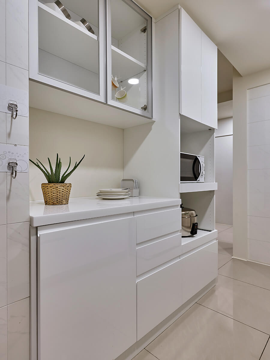 為了完善廚房的收納機能,設計師巧妙延伸系統電器櫃,既能劃分空間,又維持整體的開放感。綠的傢俱在這個案例中,以高質感的鋼琴烤漆門片工法與細膩的櫃體比例,讓原本單調的一字型廚房,瞬間升級成為夢幻料理空間。無把手的櫃體設計不僅優雅俐落,也讓日常清潔更輕鬆,檯面材質則兼顧耐用與美觀。特別是大型冰箱上方,常被忽略的畸零角落,也被同款系統櫃延伸設計收整,讓收納更完整,生活動線更流暢。這樣的系統傢俱配置,不只是視覺亮點,更實際解決了居家收納的困擾。
