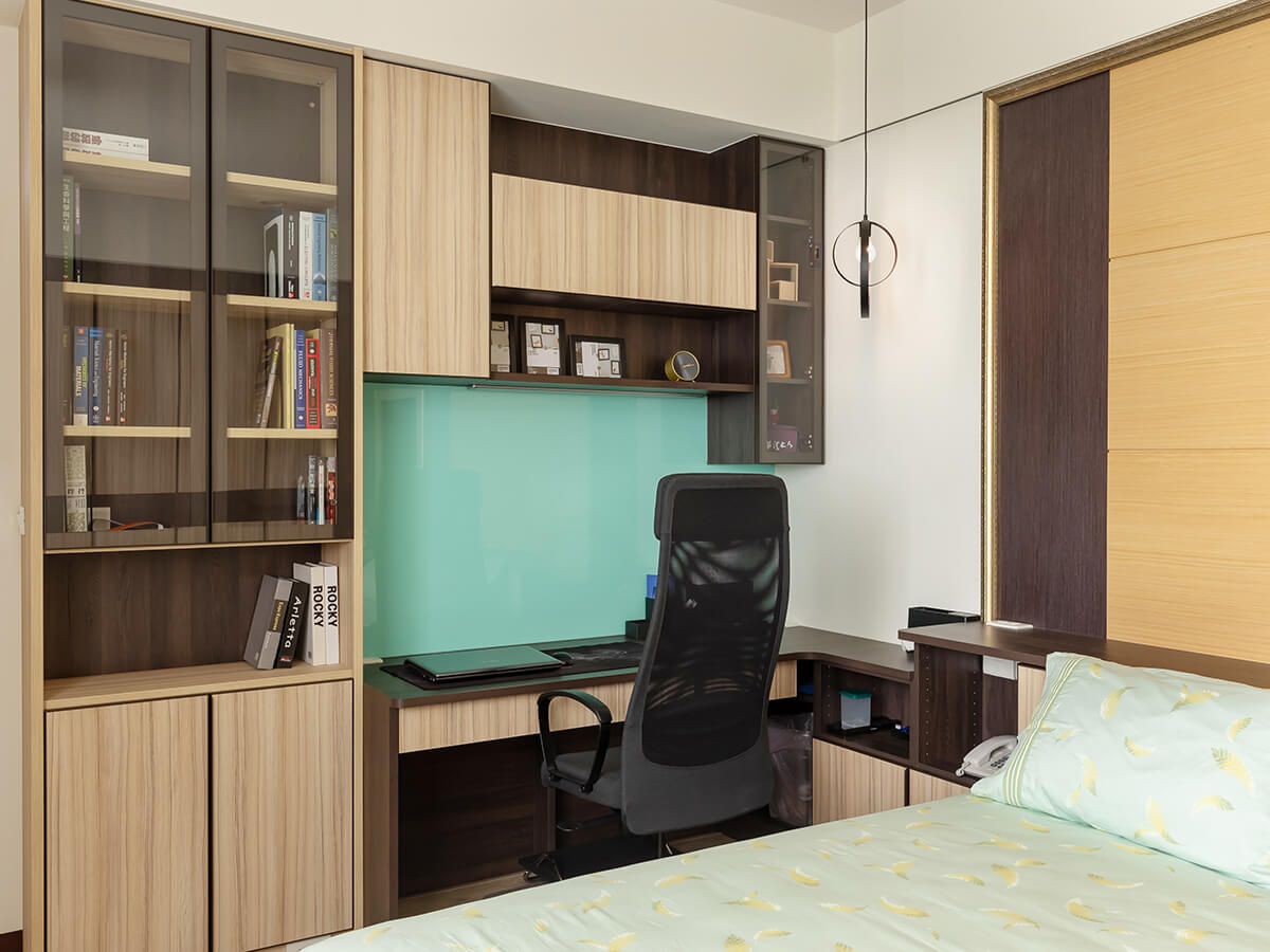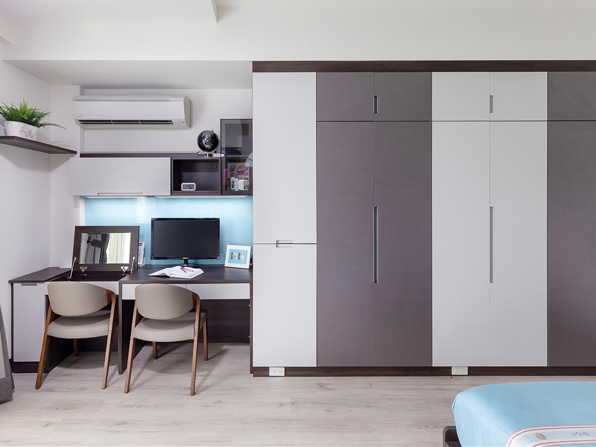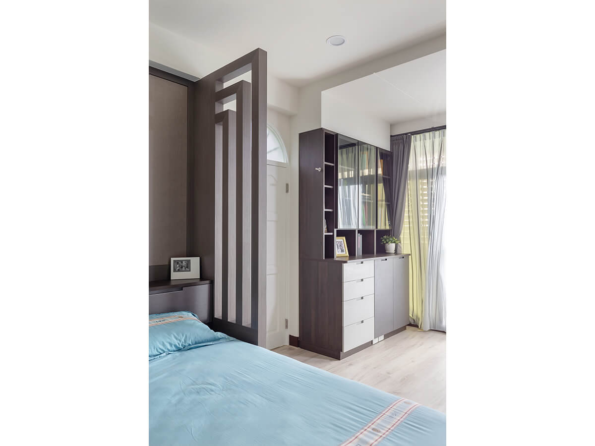 大兒子房間跳色設計不單調,透著像是商務飯店房間的度假風,直條木框的透空立架擺在床頭,發揮屏風效果,區隔睡眠區和閱讀區,同樣有著化妝桌櫃、大面積體積的衣櫃以及電腦桌上可吸附磁鐵的玻璃壁板,隨手計算、註記、塗鴉都順心。