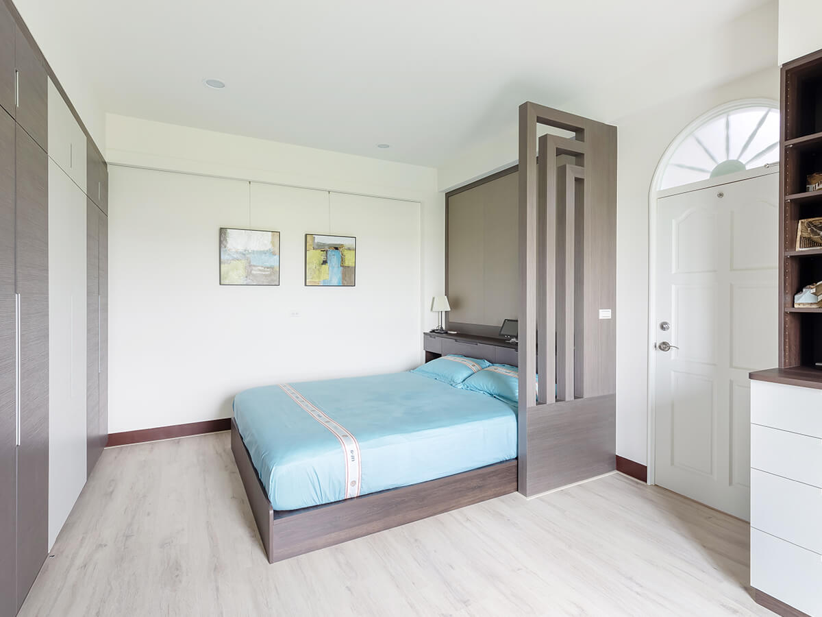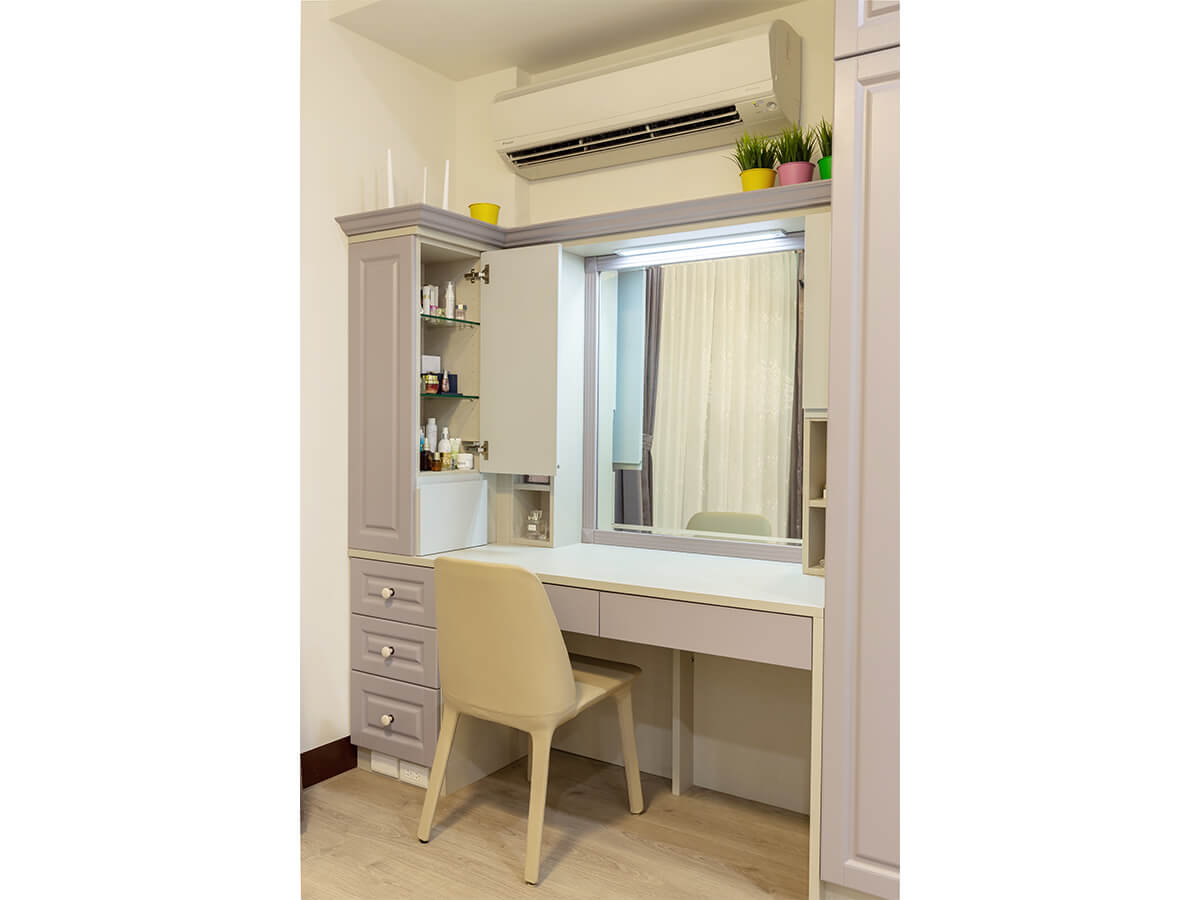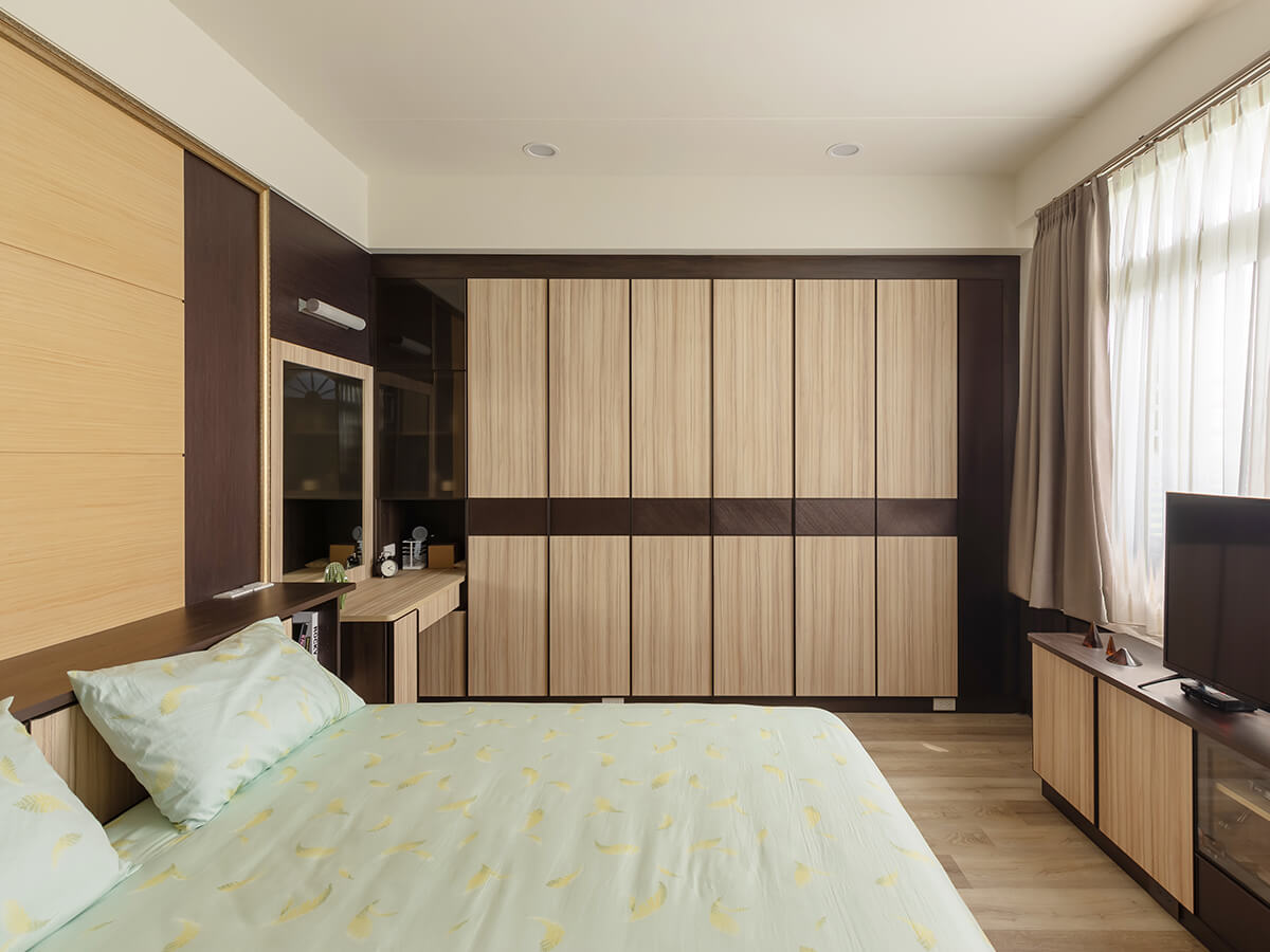 兩個兒子的房間都聚焦於簡潔設計、大量收納效果,為結婚的家居先預留好女主人肯定用得上的梳妝桌櫃,從鏡子平台底下的櫃子可以拉出夠深的抽屜,不耽心沒地方擺放私人物品,其中小兒子的房間,床後背是棉被深櫃,還有置物平台,相當方便,兩側分別是書桌和展示收納櫃、有著大鏡子的化妝桌櫃,全牆面的大片自然風木紋衣櫃完全符合收納的實際需求,尤其黃苡綺把窗牆下原本封住的部分拆除掉,設計製作出橫向的收納櫃,活化空間再利用,亮點滿滿,令人不由得發出「WOW」的讚賞聲。