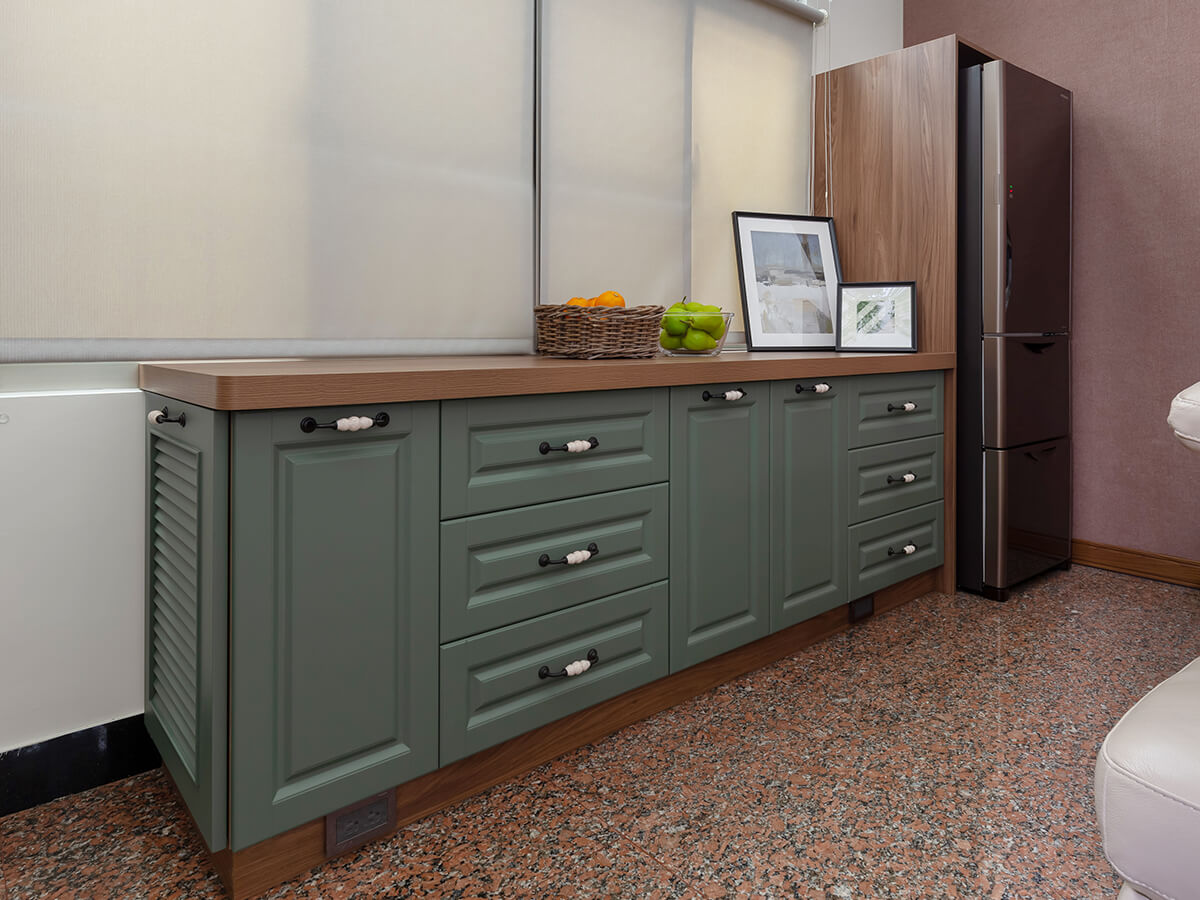 原來當作儲藏室使用的一樓,如今撥雲見日,貼近主人的生活動線,一面靠牆的書櫃系統櫃、一組舒適的沙發椅、電視下方波爾櫻木紋的收納櫃,集體洋溢溫馨的歐式鄉村風格,動靜皆宜,是看書、休閒的好所在,也很適合招待好友,愜意又自如。
