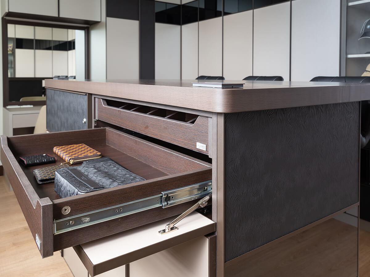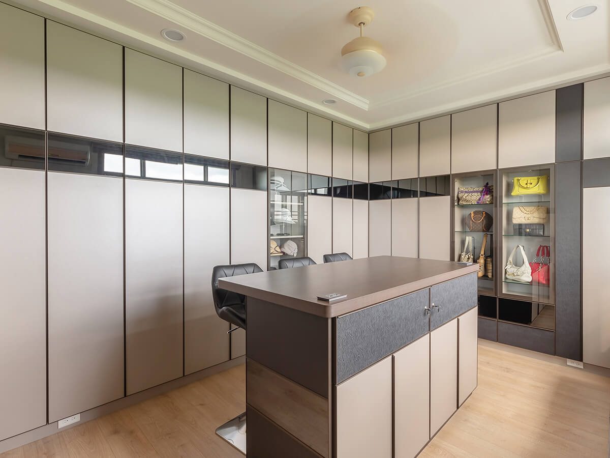 而更衣室不僅只是更衣室,還兼當起居室,在配置高腳椅的中島大平面桌上,可以整理衣飾配件、也可供李先生打電腦或閱讀、看電視,夫妻倆喝咖啡聊聊天,心貼得更近,為此,黃苡綺還在中島桌角安裝插座,桌下也是滿滿的系統櫃,儲放空間絕對寬闊,充分表達李先生對李太太的寵愛與照顧,李太太展露歡顏:「自從『綠的傢俱』黃苡綺和『理想家』設計師陳華瑗精心設計完工之後,我們倆非常開心,住得舒服,利用空間滿意度百分百,全家感情更上一層樓。」