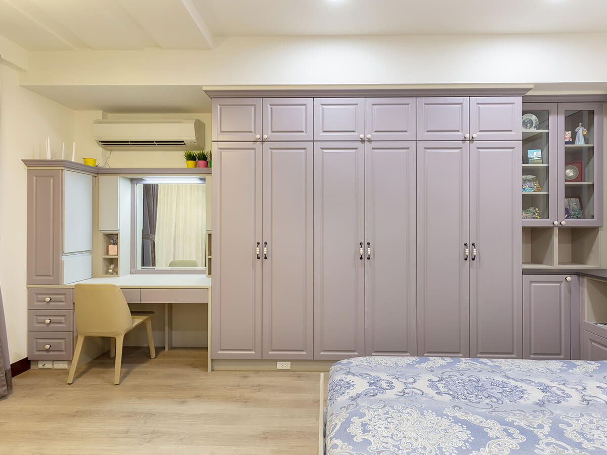 主臥室的空間利用也同樣設想周到,陳華瑗營造一股散發貴氣的視覺美感,床後方的背牆裝飾採用兩側直線條金砂圖案的壁紙材質,正中則是直線融合圓圈圖紋,達到平衡感,一打光就宛如珠簾,浪漫訴說著情話,床邊延展出去的一排衣櫃、化妝桌櫃獨具古董傢俱的簡潔雅致感,浴室旁的直立式收納櫃也呼應這份歐式鄉村風的古典情趣,連同抽屜的串珠式弧形把手細節,都做到豪華氣質一體化,足見體貼入微。
