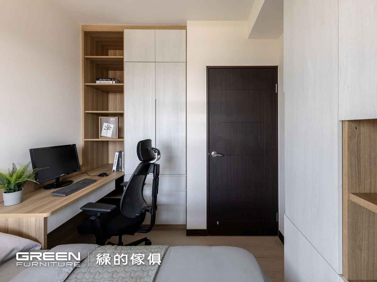 以溫潤木紋為主調延伸整體空間語彙,衣櫃與收納櫃選用木質紋理板材,與書桌、書櫃形成一致而和諧的視覺層次,在清新白色基底中增添一份沉著與穩定。搭配加高系統抽屜床、半開放式櫃體與上掀式層板設計,讓收納與使用更具彈性,也提升日常生活的自由度與便利性。