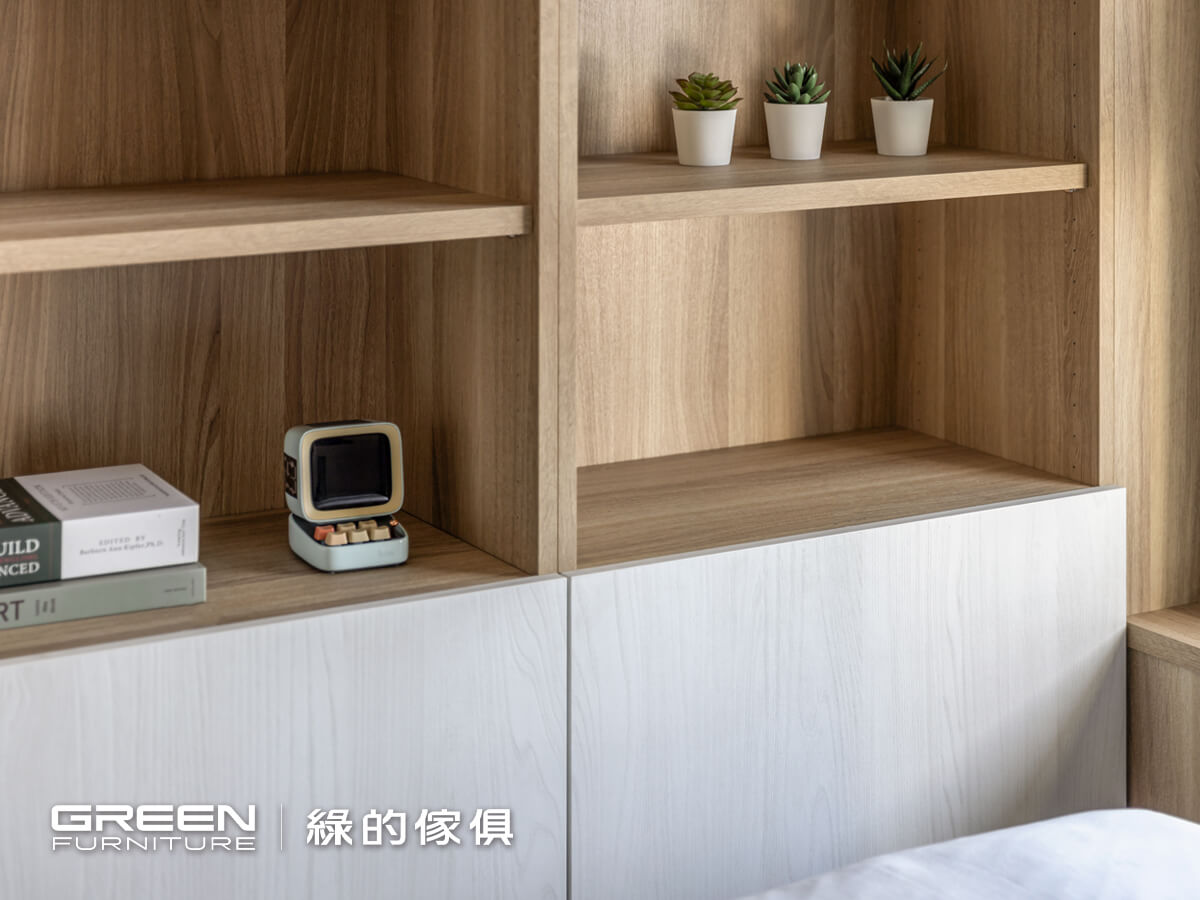 為了讓行動空間更無虞,床頭以系統板材取代,亦能兼具移動差作的需求;床頭牆面則以淡雅的淺木紋做區隔,溫柔地融入整個空間。搭配床墊是「綠的傢俱」金星Venus獨立筒床墊,能同時擁有兩邊不同軟硬度。