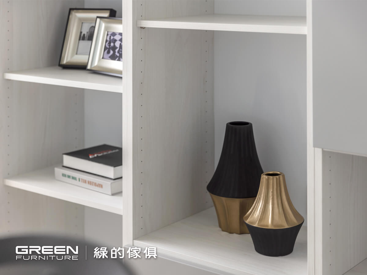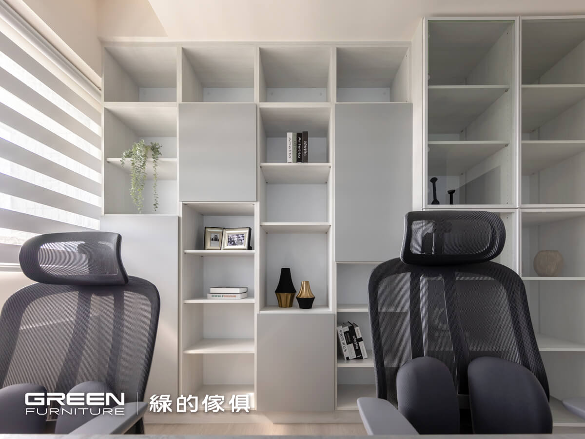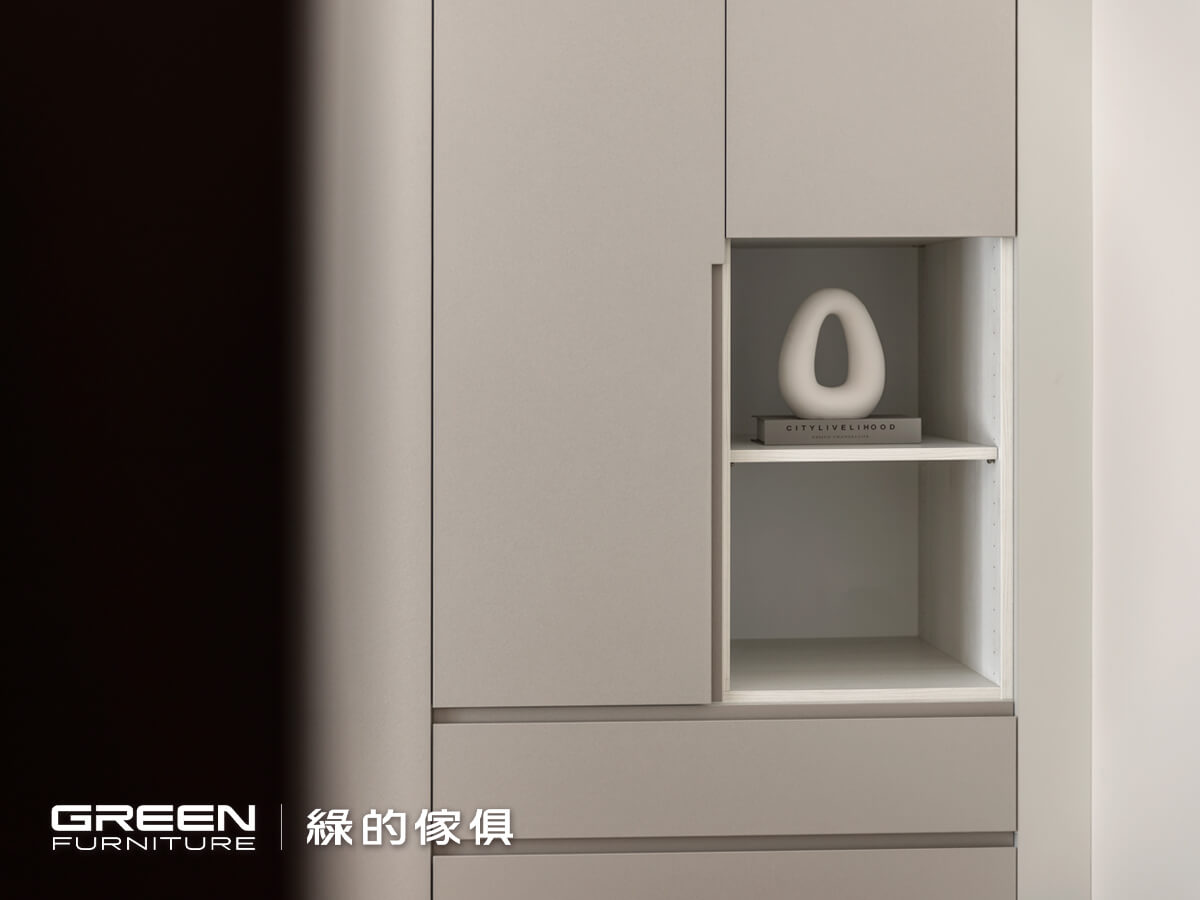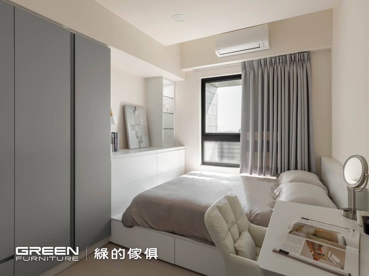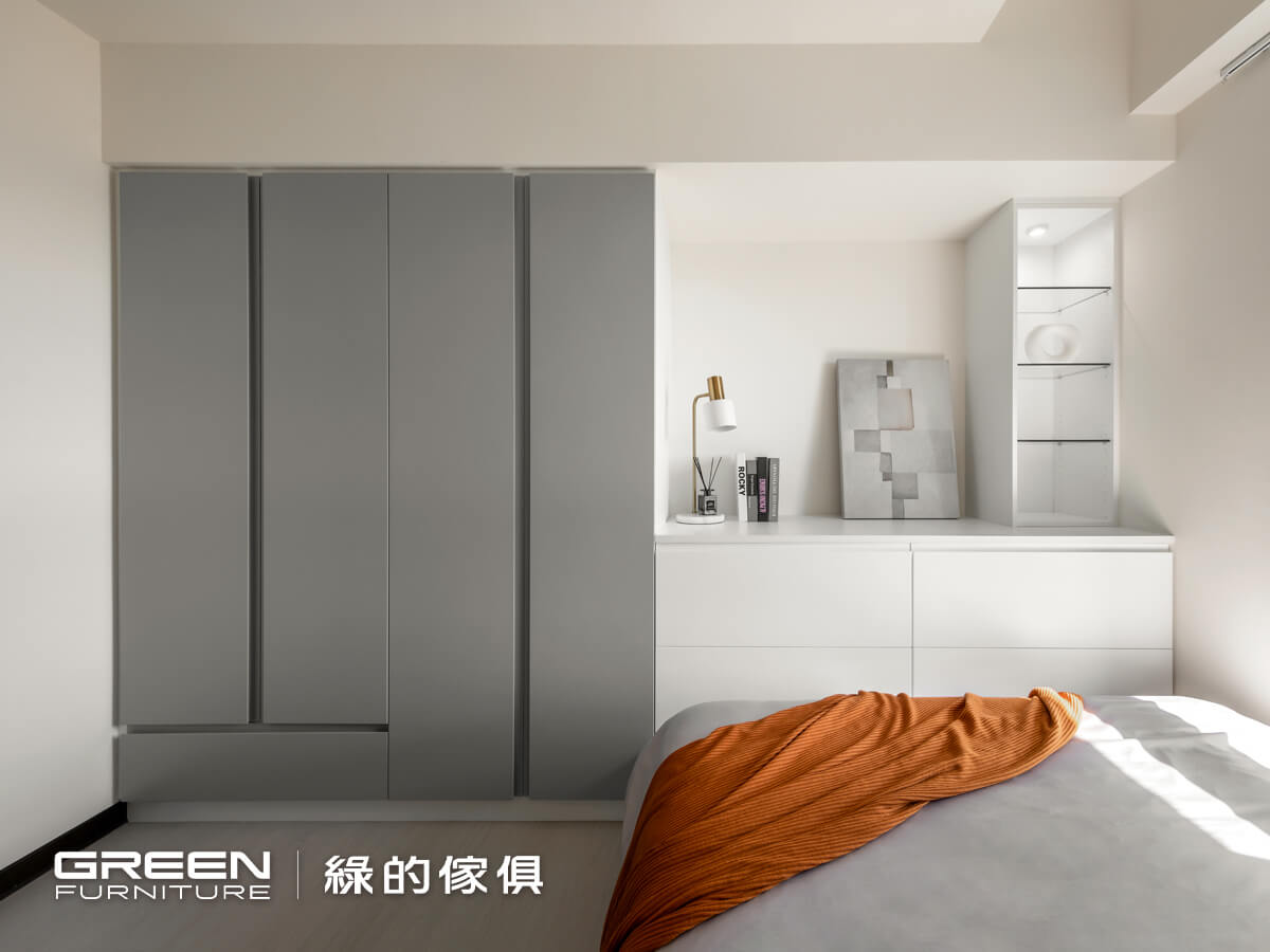 以黑、灰、白配色為主軸,白色陶烤與灰色霧面陶瓷烤漆的門片搭配,更能凸顯純粹舒適的氛圍;藉由系統板材量身規劃特性,讓訂製的系統傢俱,如:床頭櫃、抽屜床、衣櫃等都能呈現一體成型的美感,不論是收納或展示,所有空間都能被完整運用。