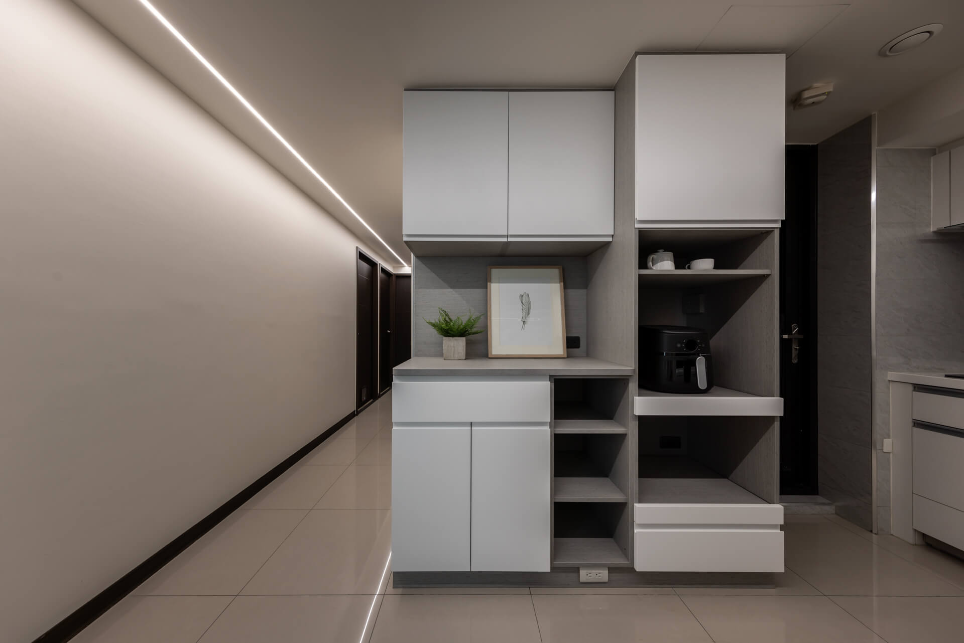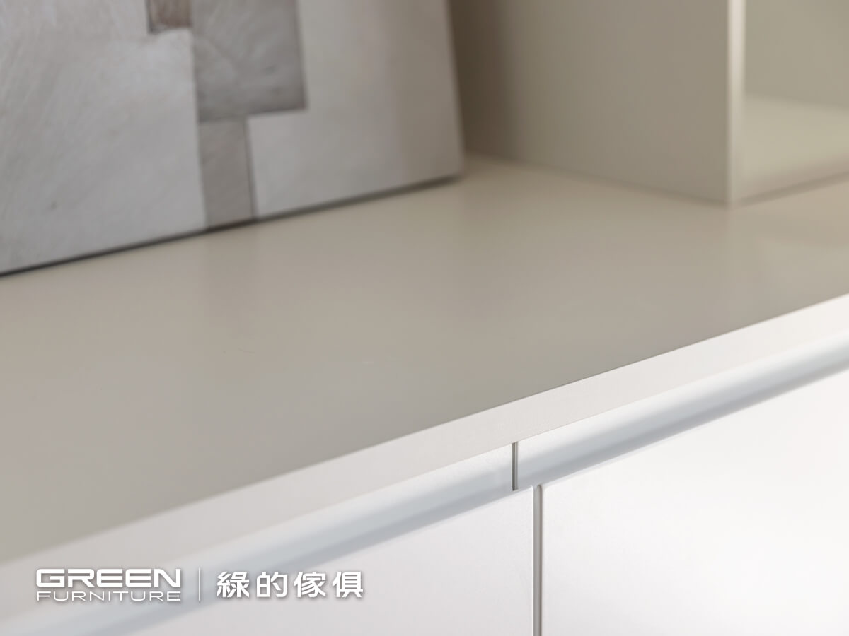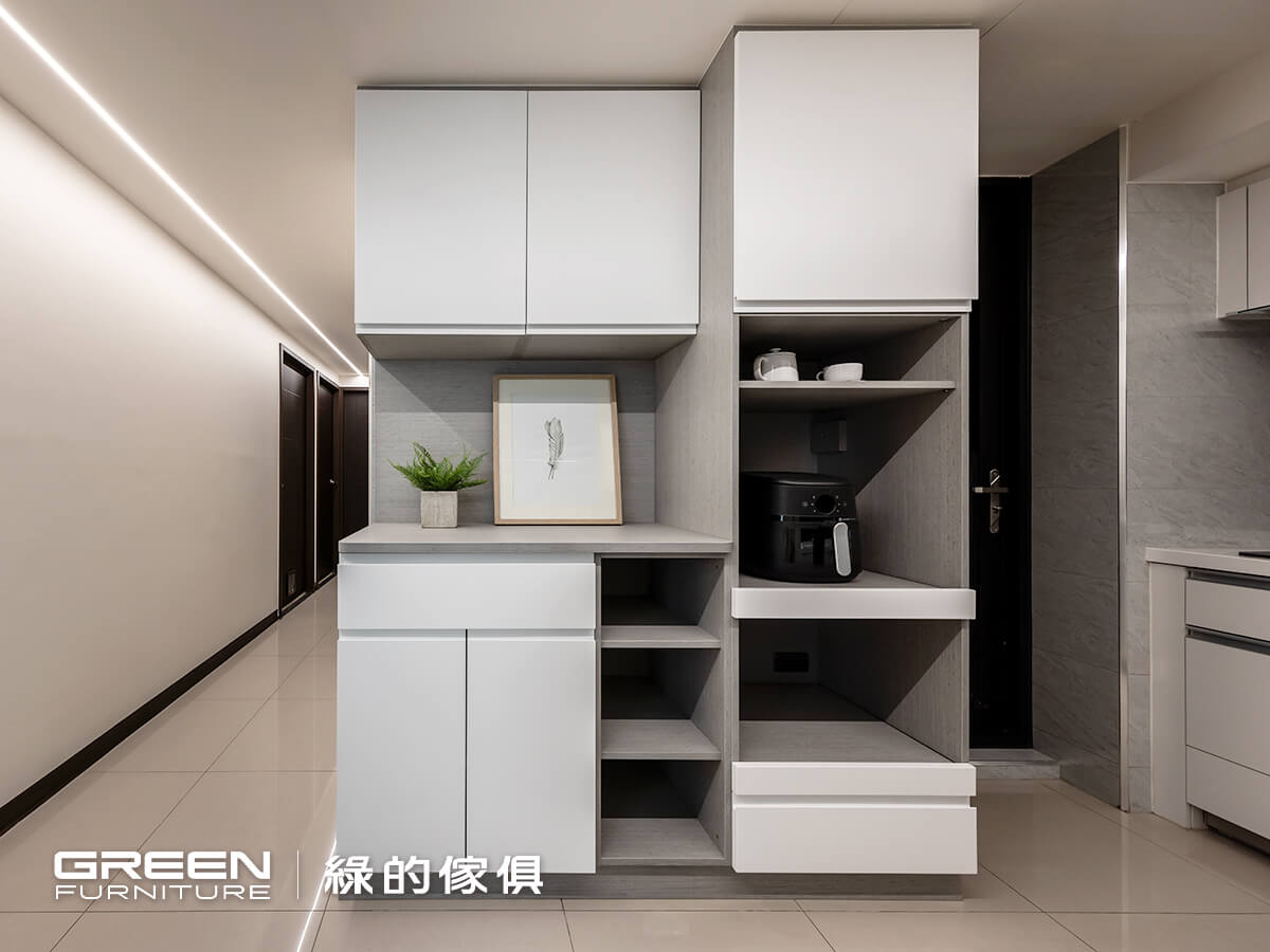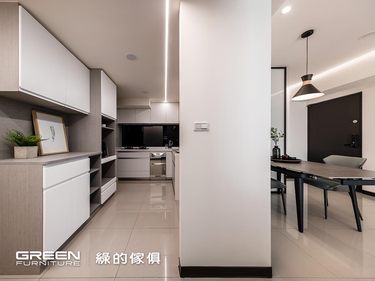 為了搭配L型廚具且考量到使用的便利性,餐櫃以半開放式搭配大面積的平台,電器櫃則採用新型的隱藏式拉盤。以白色陶瓷烤漆與隱藏式把手組合的抽屜,搭配麻紗灰櫃體,是現代風格裡一體成型具設計感的巧思。天花板上的燈條一路從走道延伸,通過系統傢俱運用不同深淺的色調,讓空間更顯寧靜且合諧。