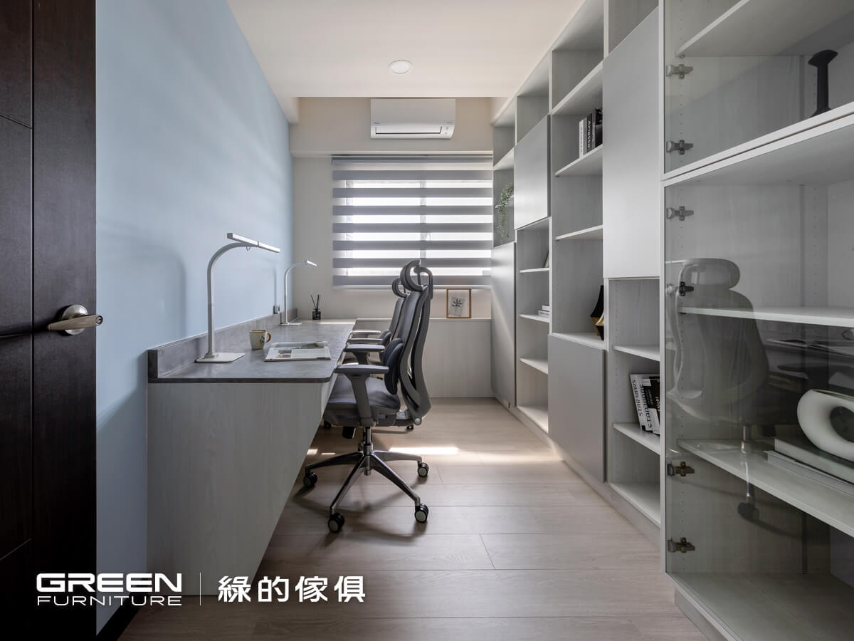 窗台的系統櫃是書櫃與書桌的橋樑,長達230公分的書桌以懸浮五金為支撐,下方無須任何支架,即可承重至200公斤。雲彩灰桌面下方是完整的鏤空,僅以側板稍作修飾,搭配白色陶烤的抽屜。淺藍色的牆面,將一片灰白襯托得更顯立體感。