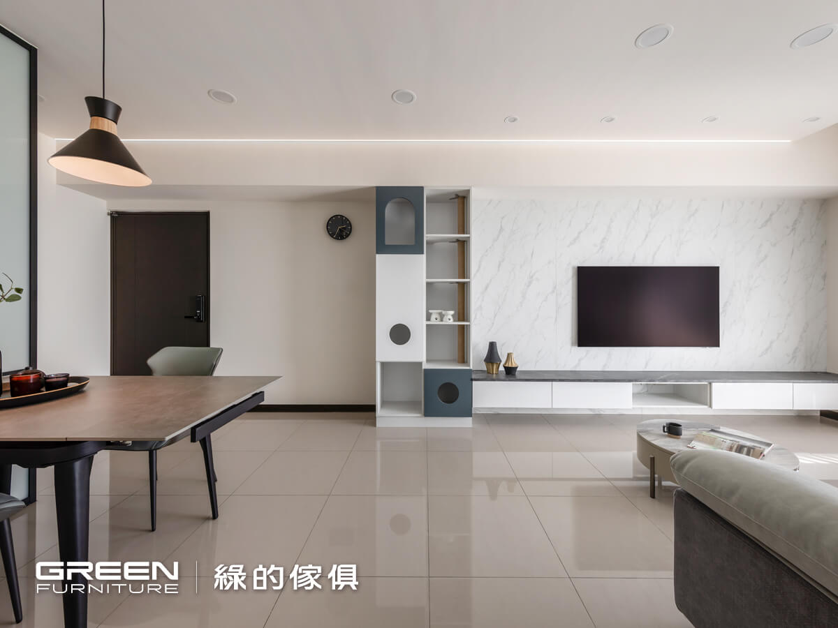 雲狐大理石鋪墊的電視牆,塑造了大自然的石材氛圍,延伸著視覺的無限想像。黑雲岩與白色陶烤的電視吊櫃組合,加上雲狐大理石踢腳板的襯托,電視櫃彷彿懸浮在一片石材上。搭配在電視櫃側邊半開放式收納櫃是貓咪的專屬空間,不論是鏤空還是半圓,都是充滿童趣的貓咪遊戲區。