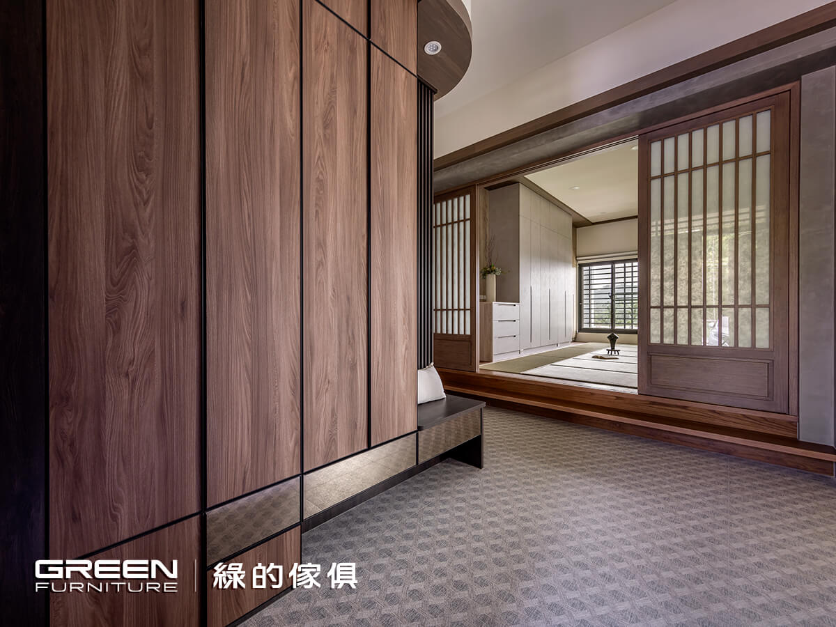 拾級而上,屬於日式侘寂的寂靜氛圍頃刻透散,專門手工訂製 11 張榻榻米,天然的草料素材,使人們無論坐站或躺臥,均能感到溫潤柔和的觸感,當女兒們帶著先生與孩子們歸家時,即可感受到來自父母無微不至的關懷,不只地坪用心別緻,壁櫃也有著獨到心思。