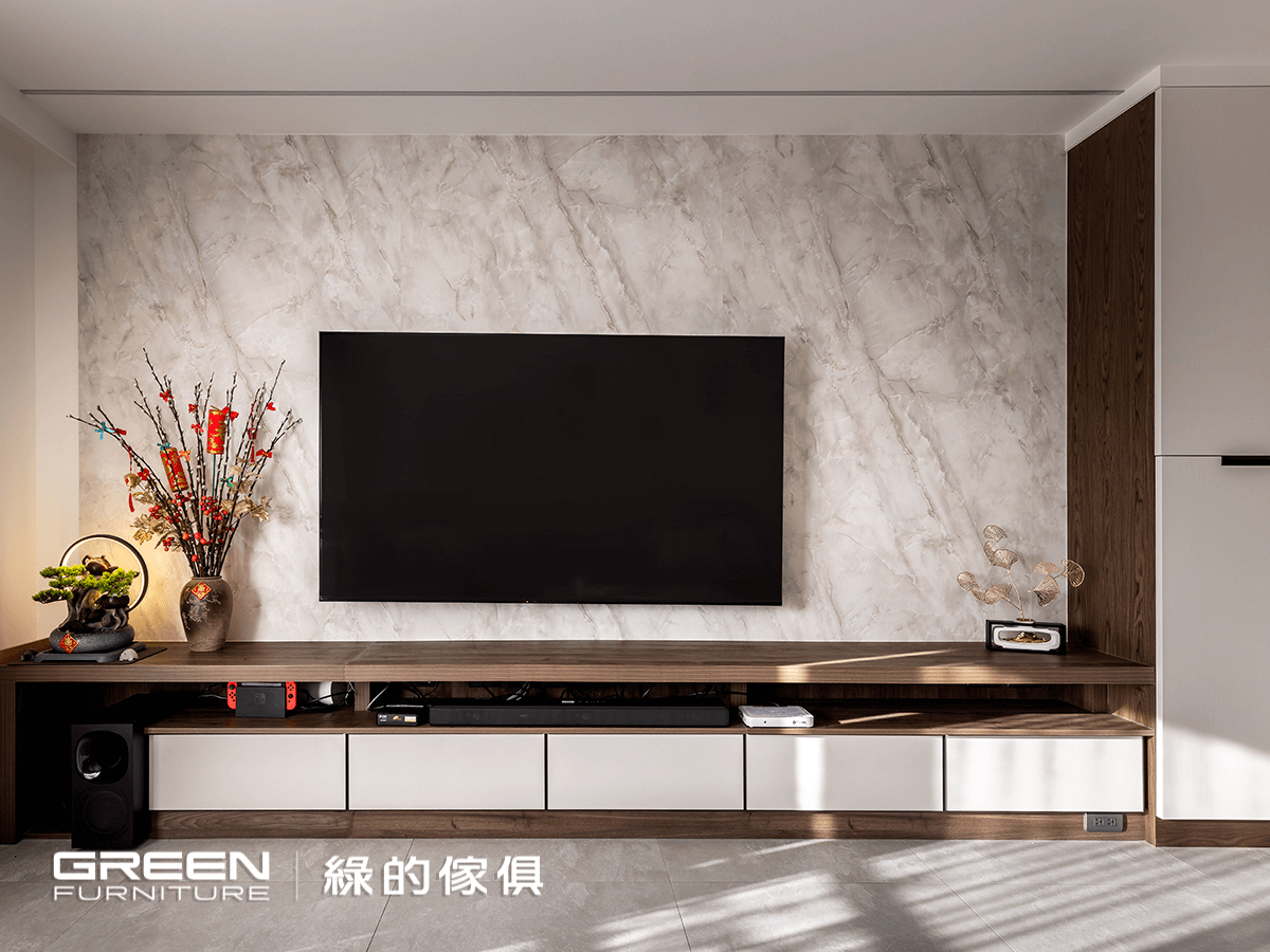 沿襲神明桌的風格,胡桃木與鑼帛是電視櫃主要的搭檔。電視牆以仿大理石紋路的膠膜鋪墊而成,營造與客廳一致的現代簡約風。平釘天花板裡包覆著老屋翻新最繁複的管線,一抹和煦燈條緩衝了視覺,聚焦客廳氛圍,讓人更能盡情享受當下。