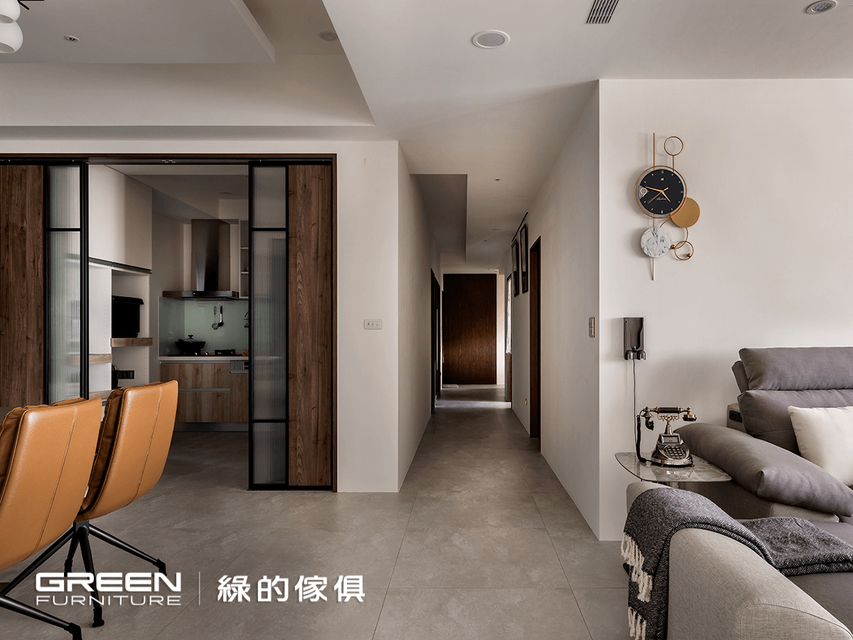 通往房間長長的廊道上,間接照明體貼地照顧著每個行經的人,也呼應著百合白的牆面,既不孤單又增添視覺變化。層次豐富的胡桃木,也低調地為走道上的每一扇門找到位置。