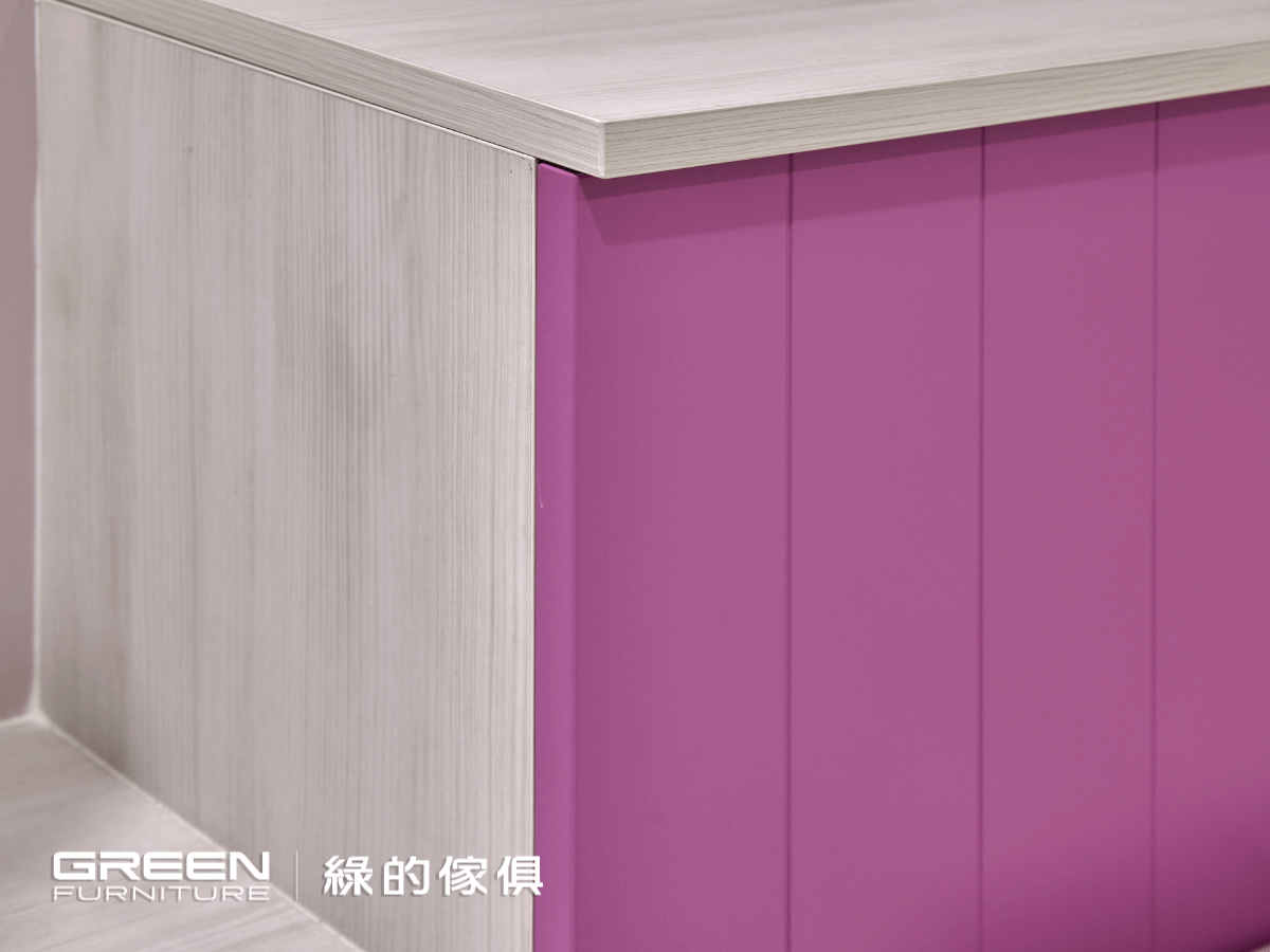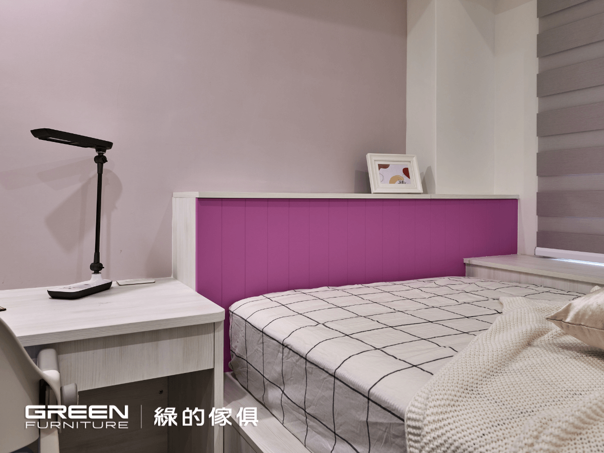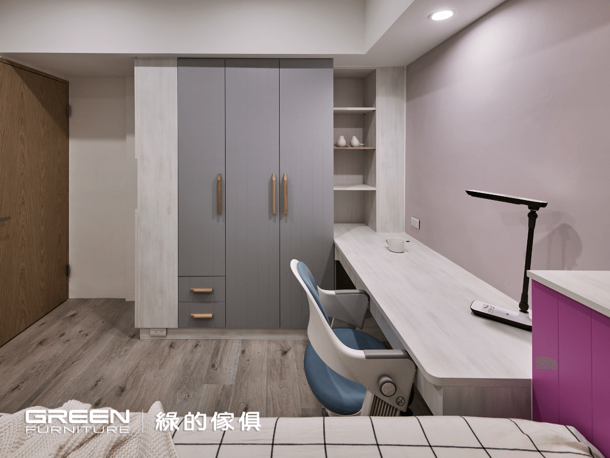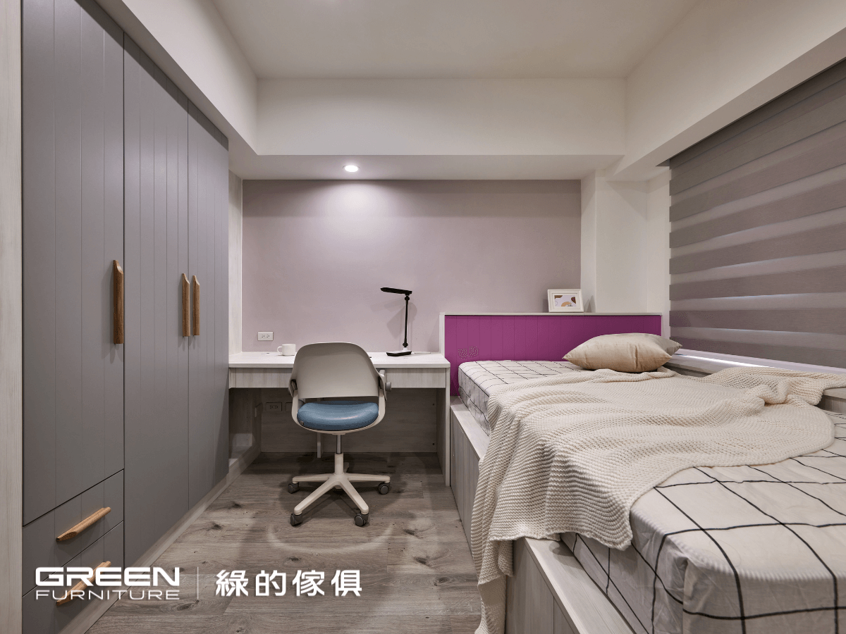 沁白的簍空衣櫃,夾帶著霧灰地中海陶瓷烤漆的衣櫃,一路延伸至書桌。粉紫色地中海造型陶瓷烤漆搭配的架高收納床,讓女兒房充滿鮮明的色彩。以兒童房系統櫃設計的架高收納床,無所不在的收納空間令人讚嘆不已。不論是床架下的尚約門把手搭配大型收納櫃,還是樓梯下方按壓式抽屜與上掀式樓梯櫃帶來的驚喜,粉紅及玫紅層層堆疊的收納空間,透露著屬於女孩的細柔、甜美色澤,空間的運用上絲毫不感窘迫。