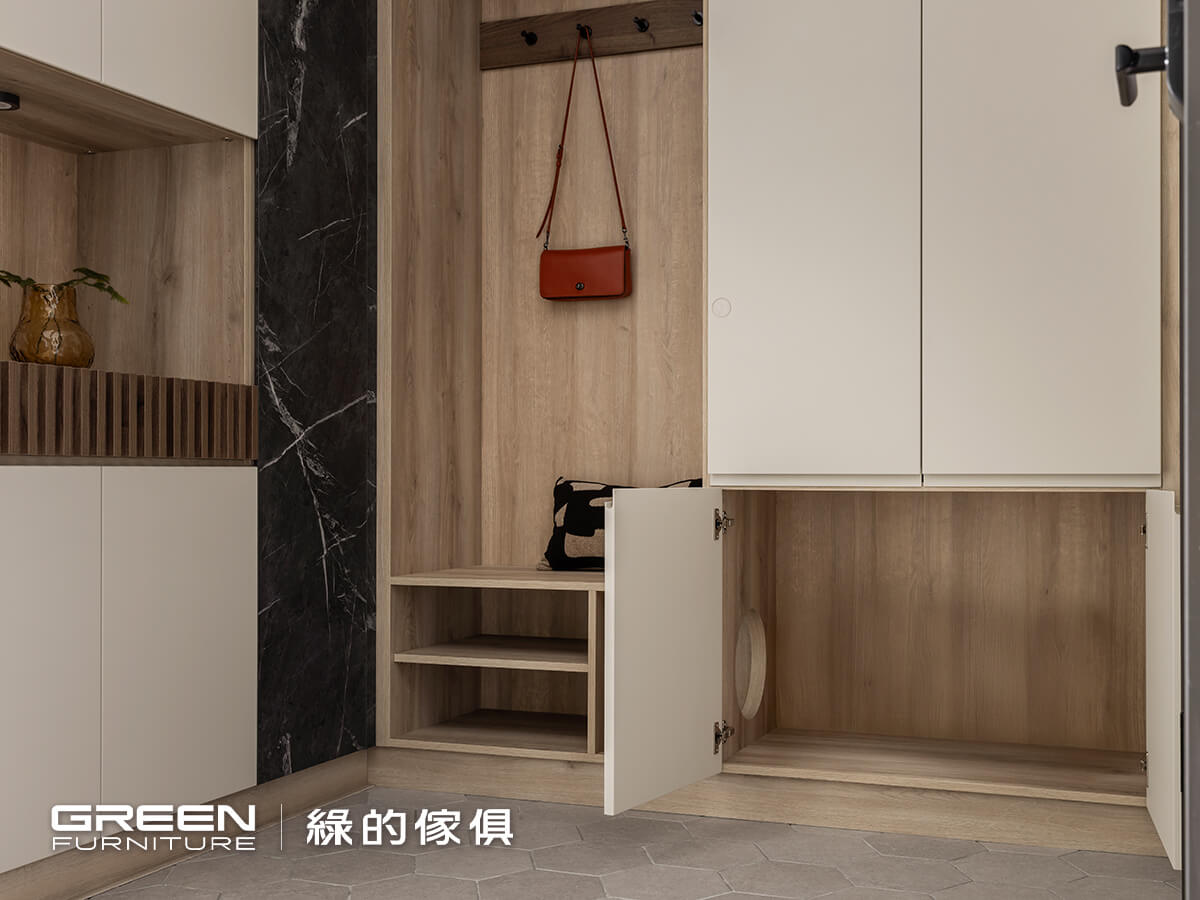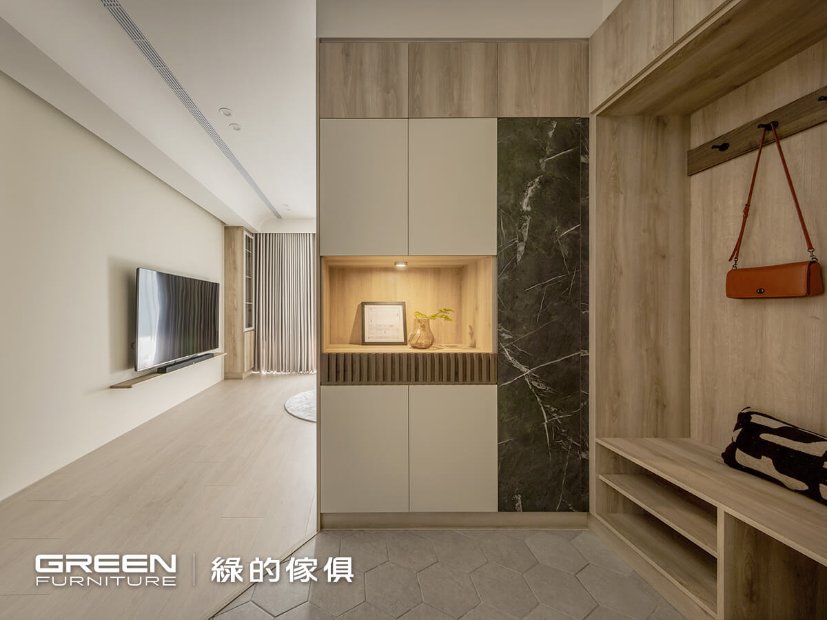 系統櫃背板則選用「黑雲岩」與「雲彩白」兩種帶有石紋層次的對比色系統板材,巧妙呼應整體風格,將日常收納、裝飾與玄關裝潢巧妙融合,成為入門即見的視覺亮點。