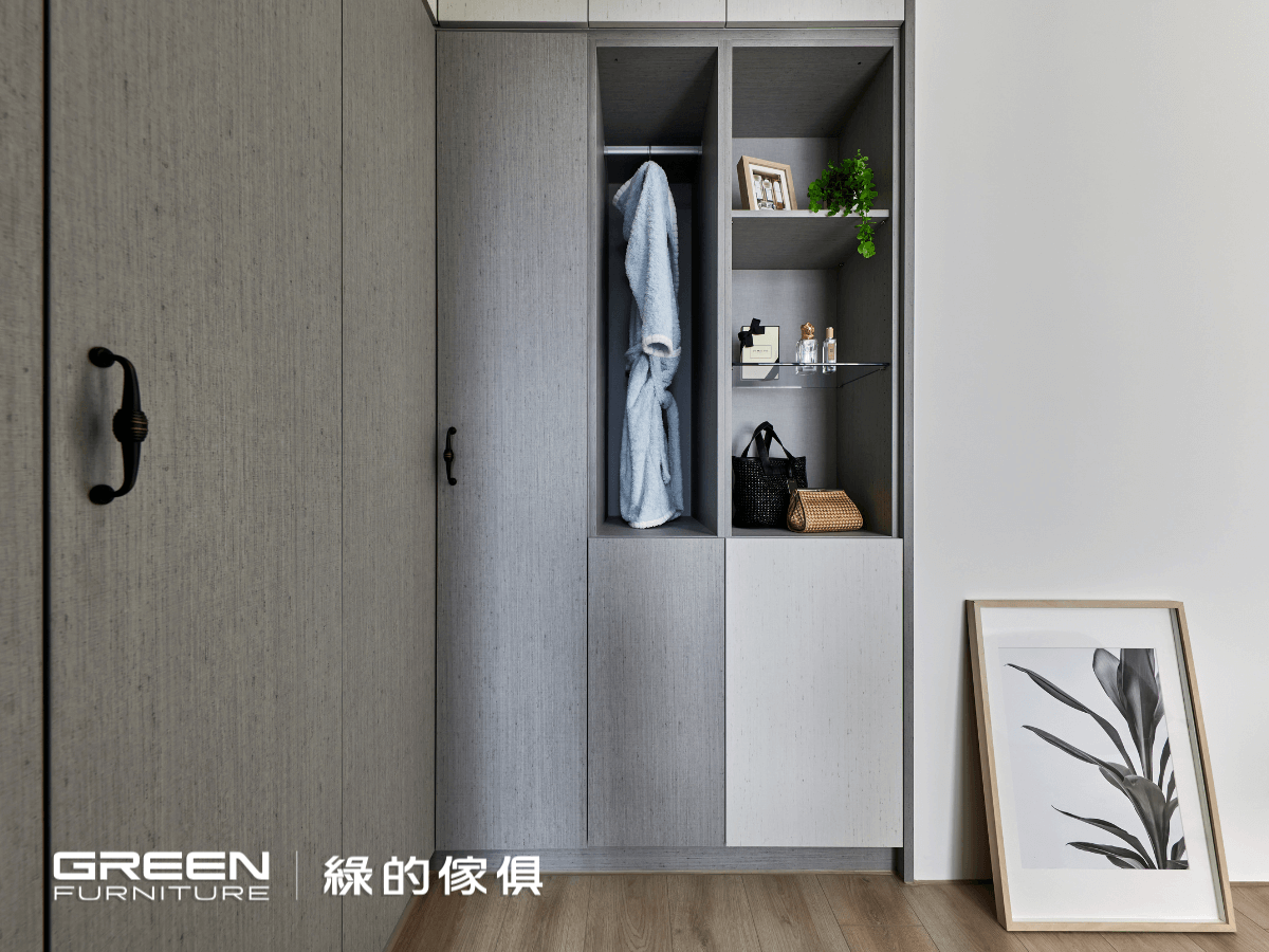 為了貼近日常使用需求,特別根據衛浴動線設置一道開放式格櫃,方便收納浴巾、沐浴用品與睡袍,隨手取用更顯生活便利。全室選用亞麻布紋系統板材,以灰色與米色為基調,營造出柔和不擾眠的氛圍,讓人享受每一刻靜謐睡眠時光。