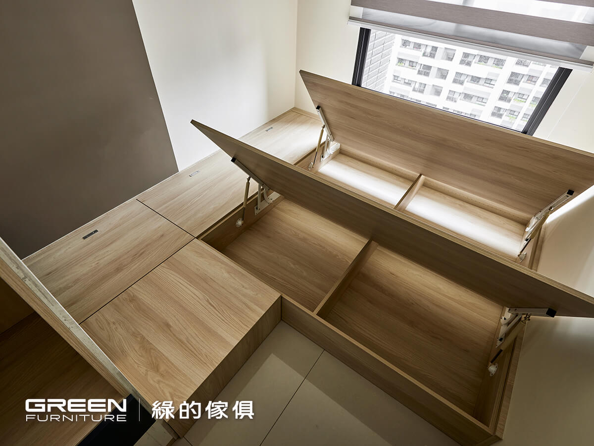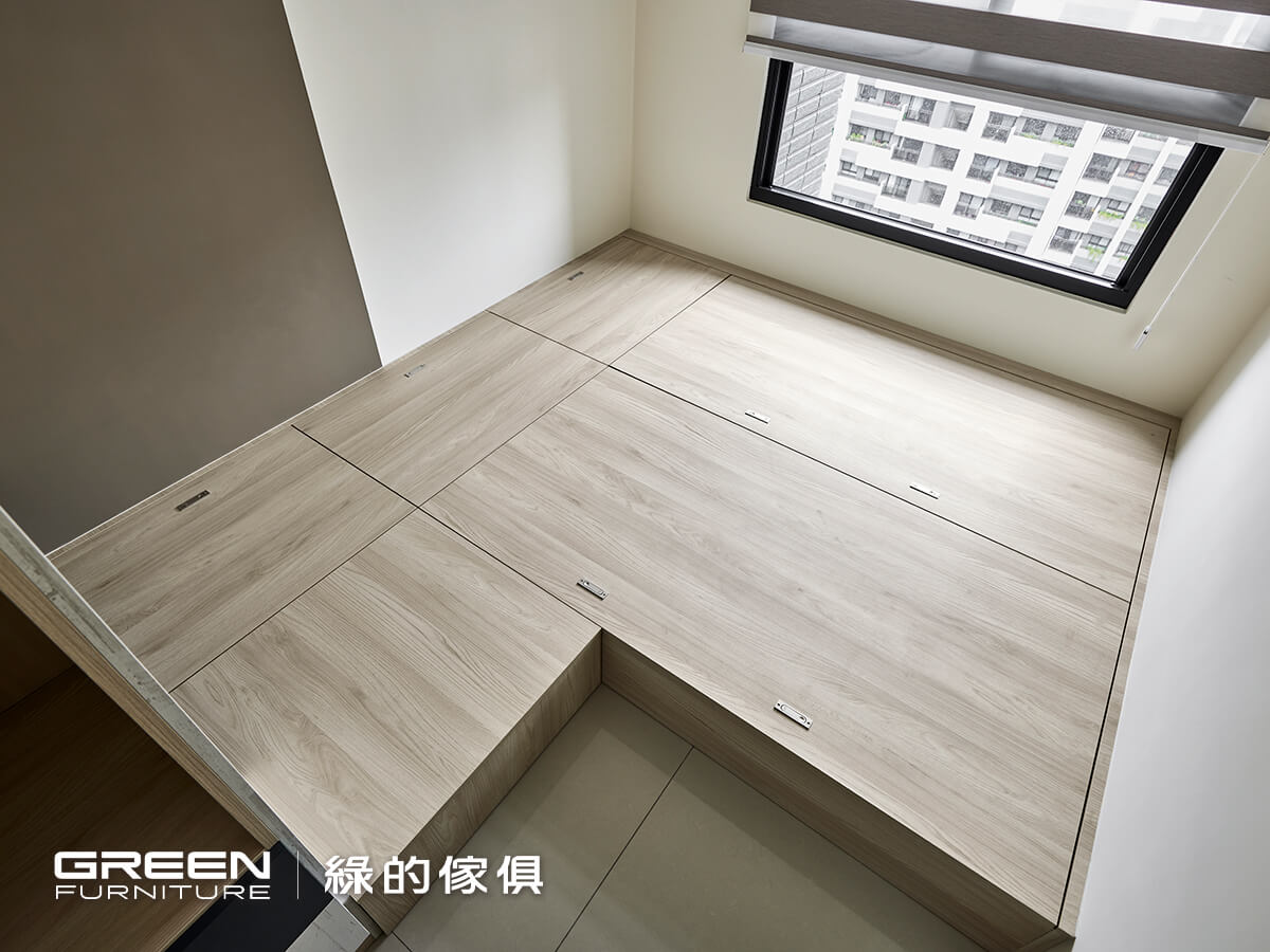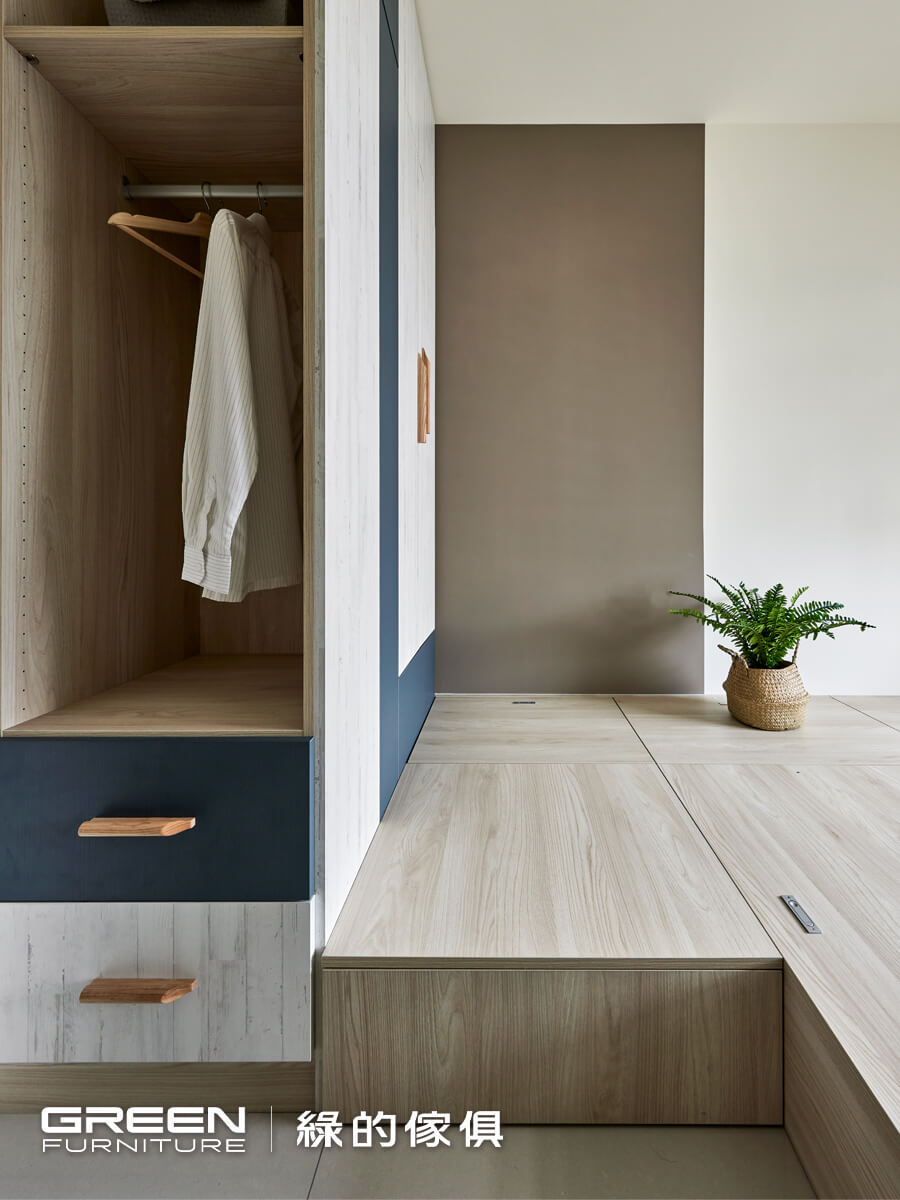 日式風格的空間,主功能為儲藏室,一面面以堅固鉸鏈拼接著的木紋蓋板,強化承重力可供架高,既可當大睡舖的木質床,同時還是幼兒學習爬行、自得其樂的遊戲空間,蓋板「開箱」就立刻變身為意想不到的大件傢俱或棉被收藏層,近門的一格則是抽屜開關,由外拉開不費力,全都絕妙地透過設計功力達到同一空間功能靈活運用的極大化。