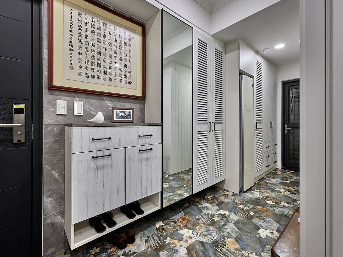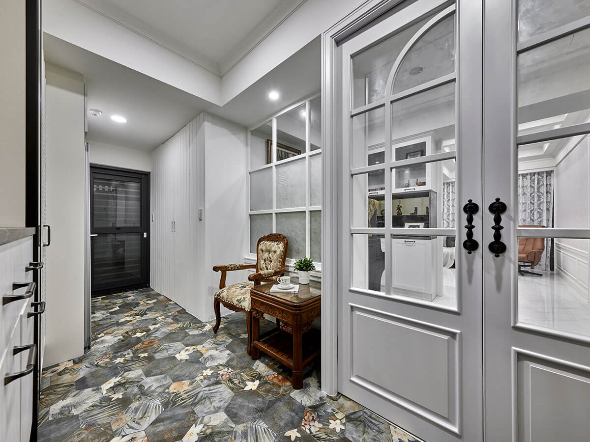 玄關以經典歐式雙開門作為迎賓起點,結合霧面格子玻璃與花卉六角磚鋪陳,不僅具設計感,也巧妙地將玄關與內部區域劃出柔性界線,讓返家過程多了層次與儀式感。為了應對日常使用習慣,特別設計了一道全高多機能玄關系統櫃,將鞋櫃、穿衣鏡、吊掛區與外衣收納一體整合。