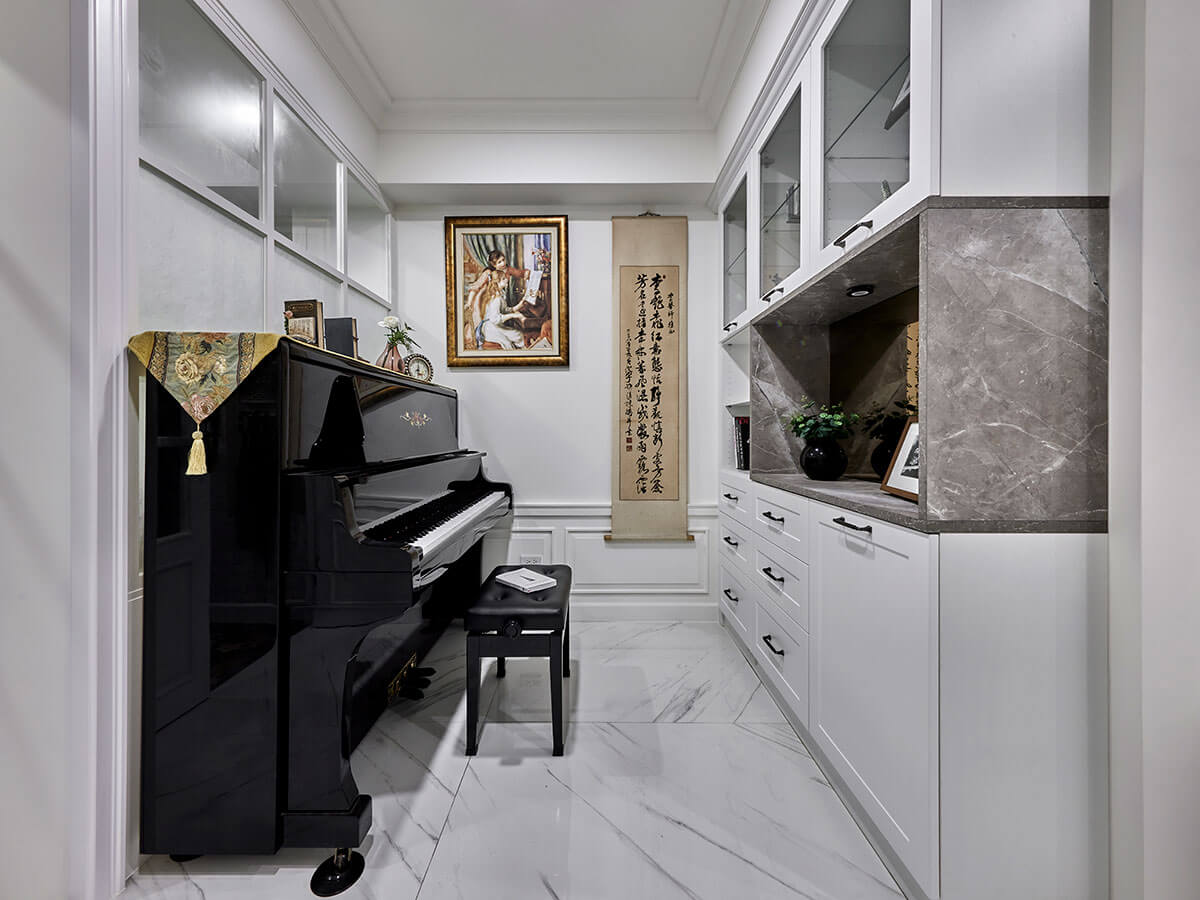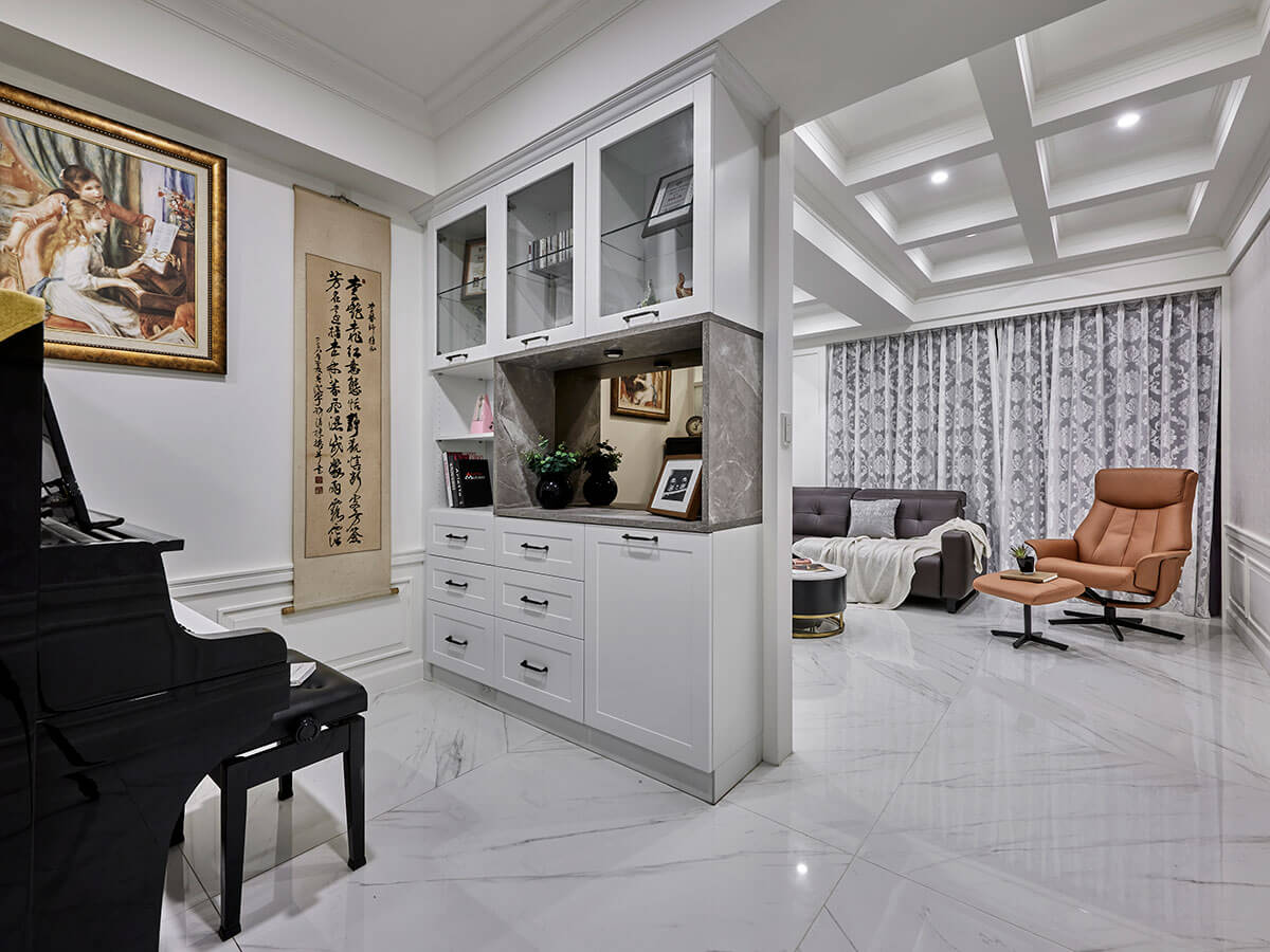 敞開格子玻璃門,如歐美雜誌般的唯美情景旋即映現,以琴房揭開家的優雅序幕,分別挹注柔白與雲霧石紋理,築起一方蒐藏時光記憶的櫥櫃,時刻回味昔日的美好點滴,循序而入,典雅純淨的畫面,源自女主人企望將客廳當作中繼點,藉此平衡二側私領域的迥然調性。