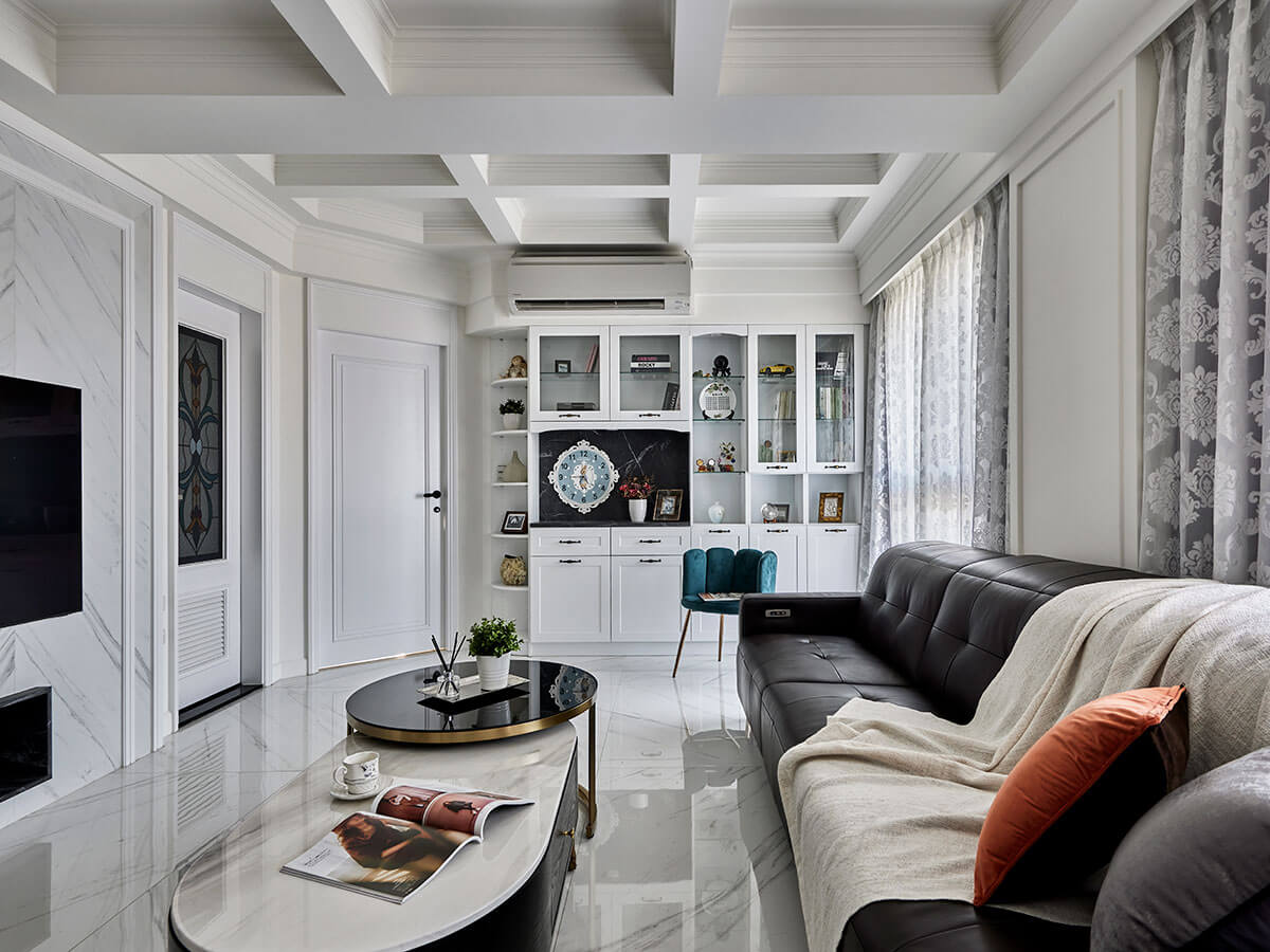 四房兩廳裝潢涵蓋天花設計亦是用心別緻,「客廳上方有一支大樑橫貫,所以我們試著以格子造型分散樑體注意力,同時刻意校準對齊電視牆,平衡視覺感受。」設計師專業說道,如此一來,不只消弭橫樑突兀、無形撐開垂直高度,亦烘塑出獨有的人文書香氣息。