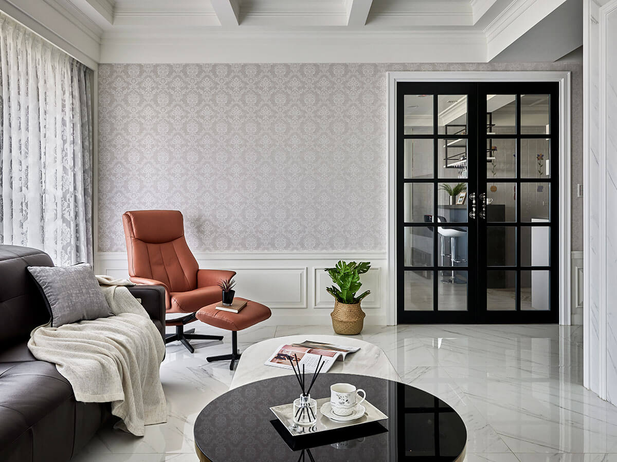 深知此的設計團隊,以純白陶瓷烤漆系統板材框築立櫃,揉合黑雲岩板材平衡輕重,同步於主牆佐以奢雅細膩的銀狐石紋理,「對我來說,家的溫馨感不是來自木紋,而是壁紙與布沙發。」李醫師真切分享,正因如此,設計師即於立面鑲裹古典花紋壁紙,透顯一份溫暖優柔的氣質。