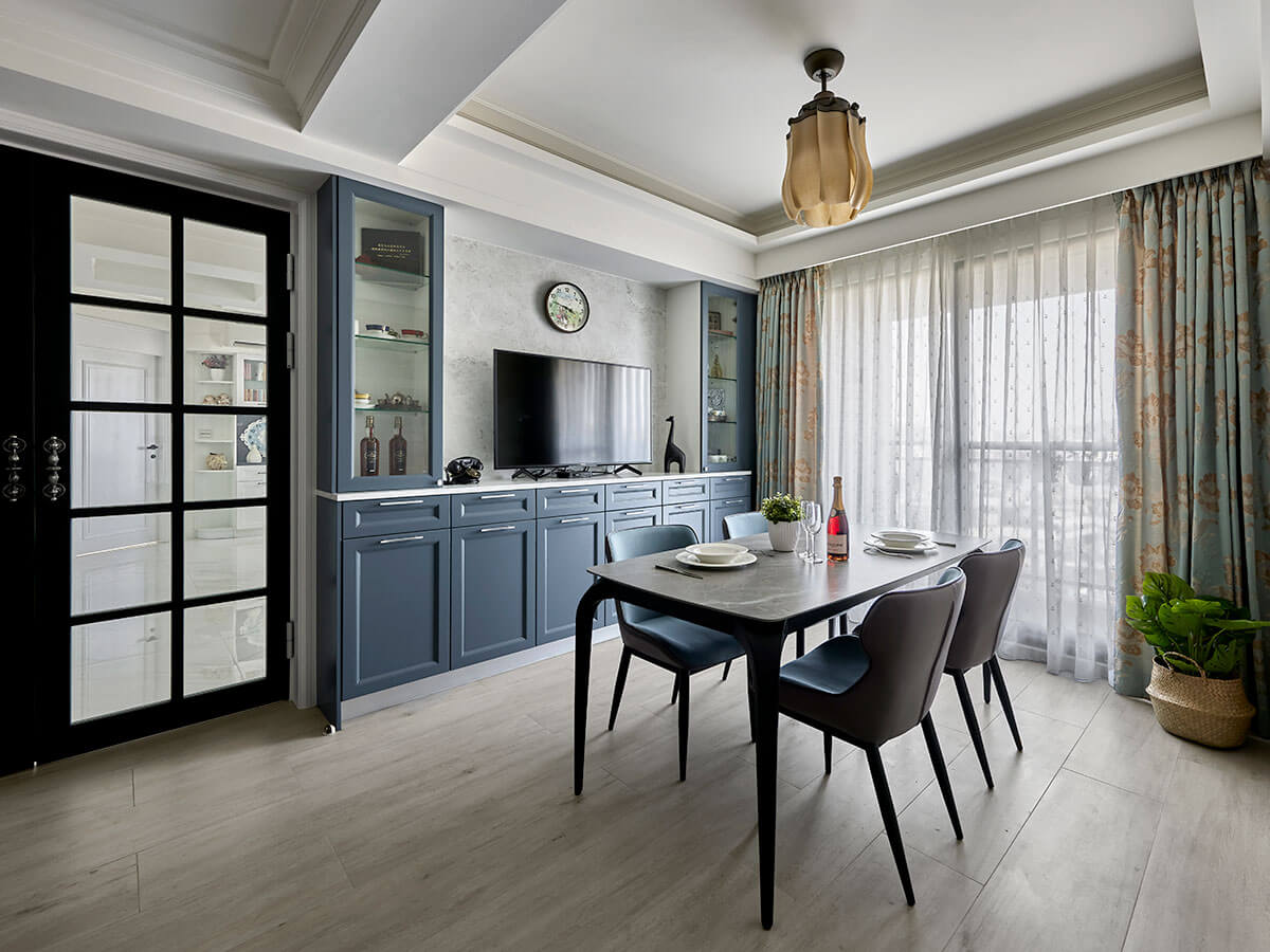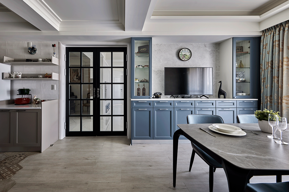 因應各場域調和不同的元素,是李醫師一開始所提出的主要需求,從餐廚區以南法鄉村風落筆,書房則以秋谷綠色調形塑久看不膩的自然調性,私領域則分別挹注氣質灰、霧藕粉與霧藍綠色調,各自彰顯獨有格調,具空間樞紐用意的客廳,以溫柔淨白協調彼此的迥然調性。
