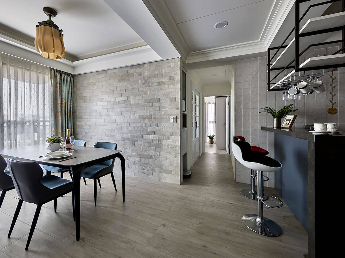 不同於常見的中島與吧台一體設計,本案刻意將兩者獨立分開配置,讓中島保有輕食備餐功能,而吧台則成為泡咖啡、讀報紙、親子互動的共享小天地。這樣的中島吧台設計提升了使用彈性,也讓整體空間顯得更從容有序。搭配大片對外窗的自然採光,以及仿古磚與陶板材質的層疊混搭,讓廚房呈現出自然不造作的溫潤表情。