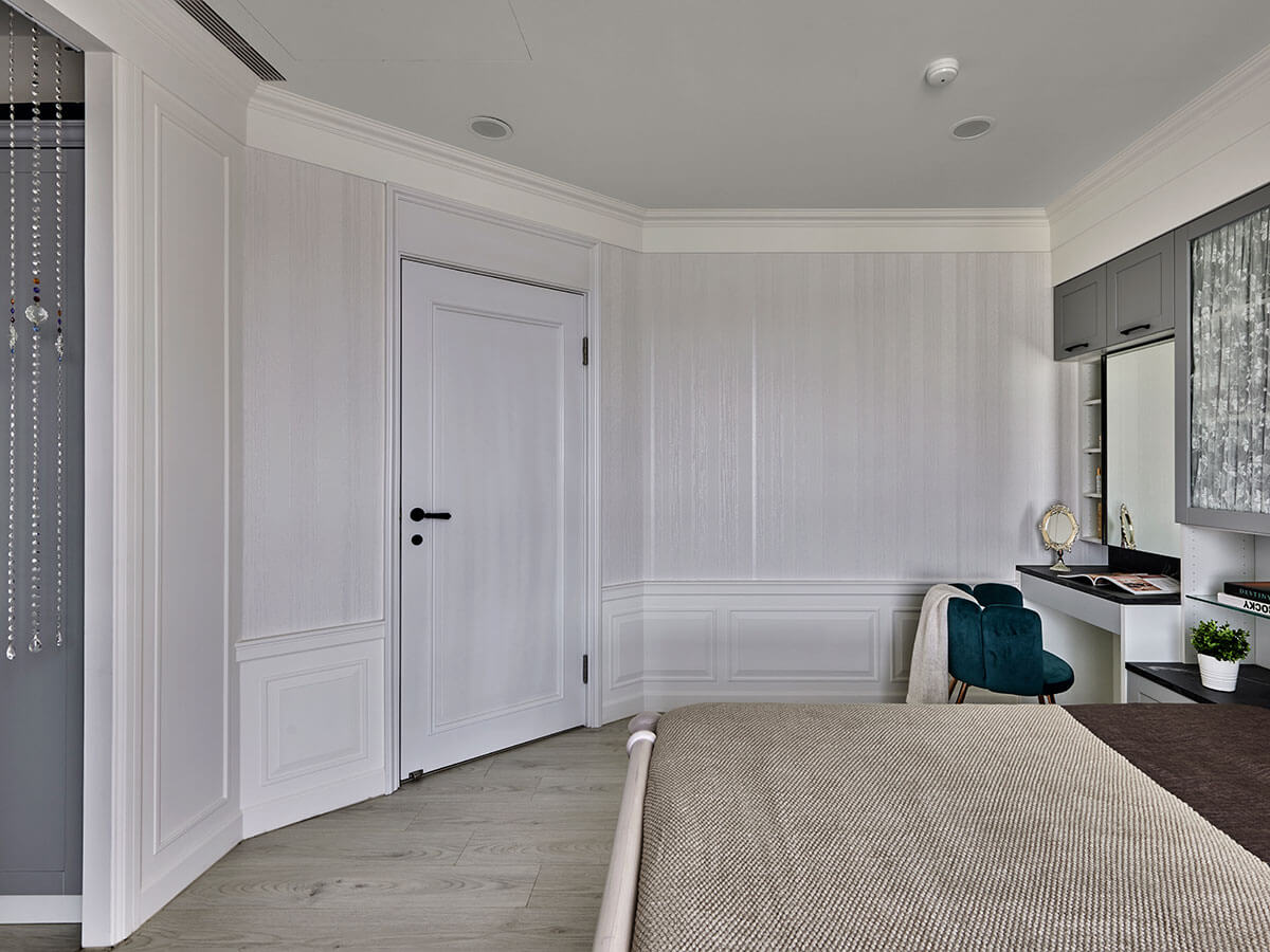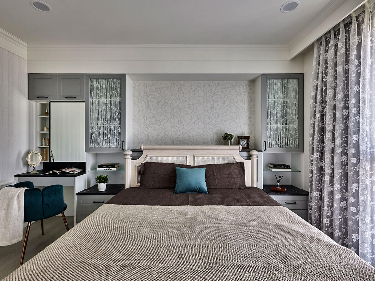 由於李醫師不希望門對門,所以我們採用斜向格局化解問題。」設計師細心說道。甫至主臥,溫柔唯美的氣息旋即飄逸,源自嚴選陶瓷烤漆板材相映壁紙,以氣質灰與古典花紋鋪序溫馨氛圍,佐上一襲優雅精緻的繡花紗簾,如實體現女主人的心之所向,同步於床頭砌築一道矮櫃,使收納機能擴增於無形。