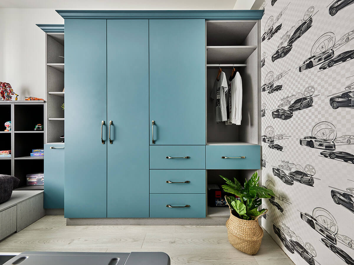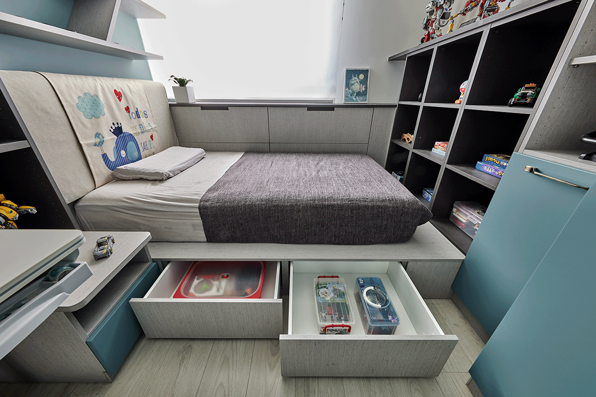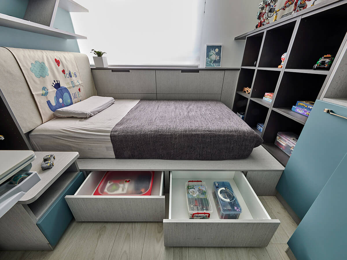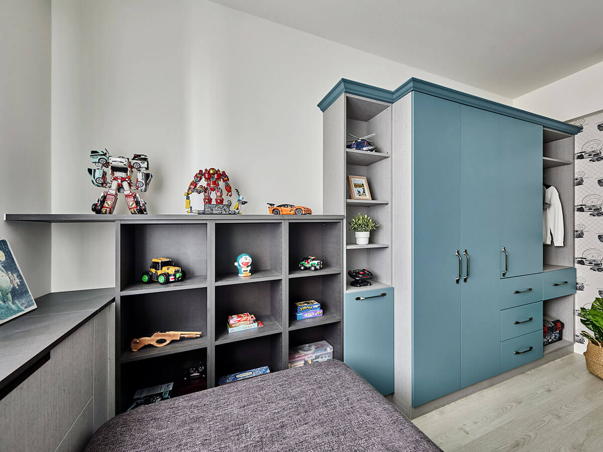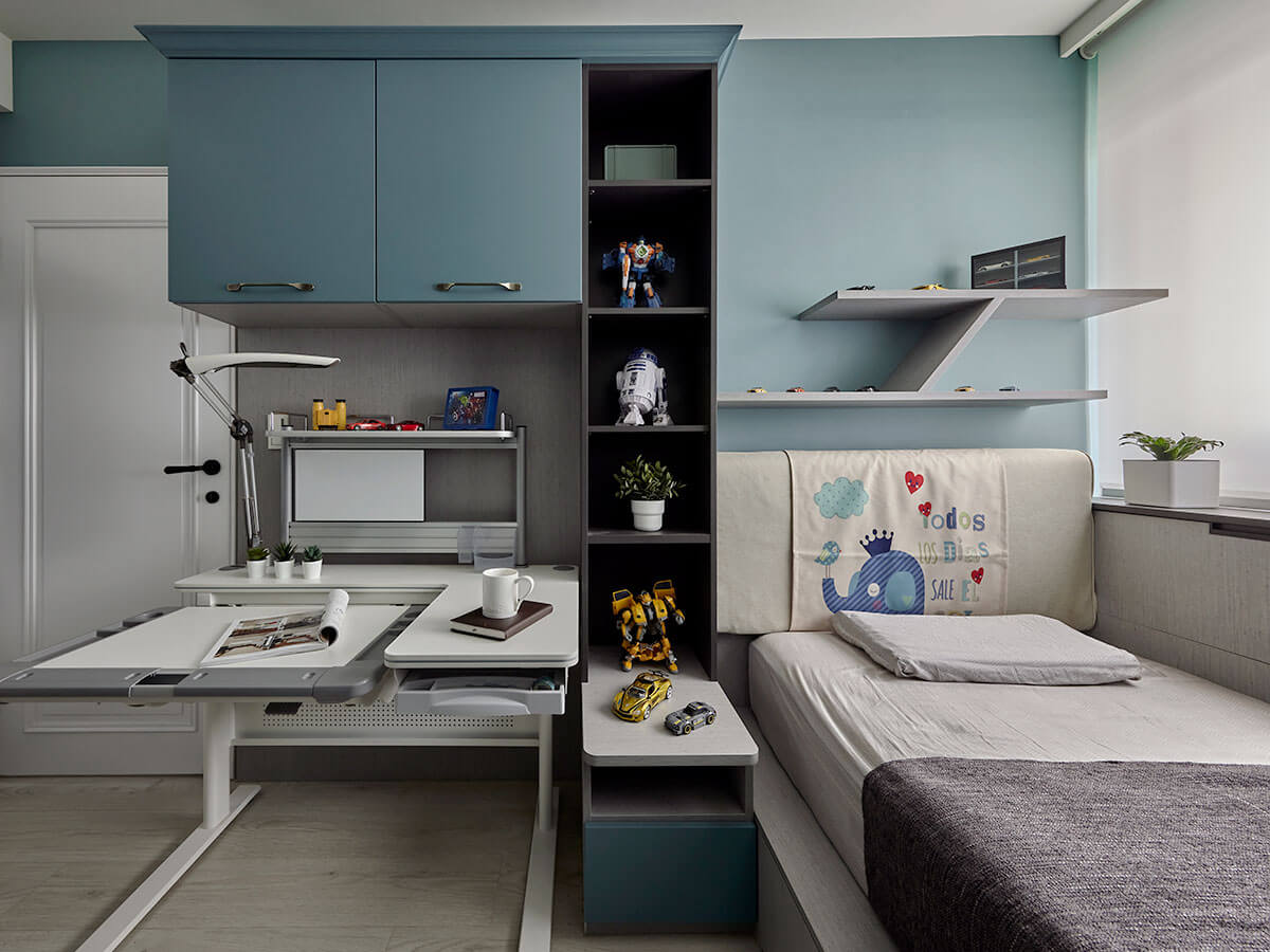 目前就讀小五的小兒子,以霧藍綠搭配奔放不羈的跑車壁紙,體現小男孩自在率真的氣息,同步基於空間格局較為精簡,以系統板材量身訂製一方抽屜床,並沿著周圍佈局開放格櫃與下掀式櫥櫃,大幅擴充收納機能、發揮坪效最大值,並於主牆採以斜向層板,使蒐藏的汽車模型有序陳列,與此同時,也依據現有的傢俱調節系統櫃尺度,使李醫師所採買的調整型書桌完美融合,陪著孩子一起走過成長時光