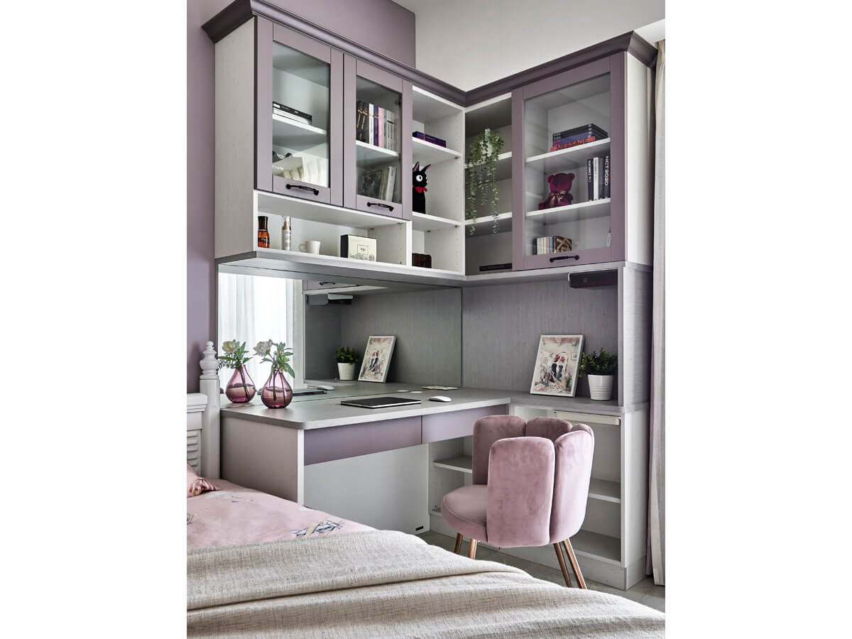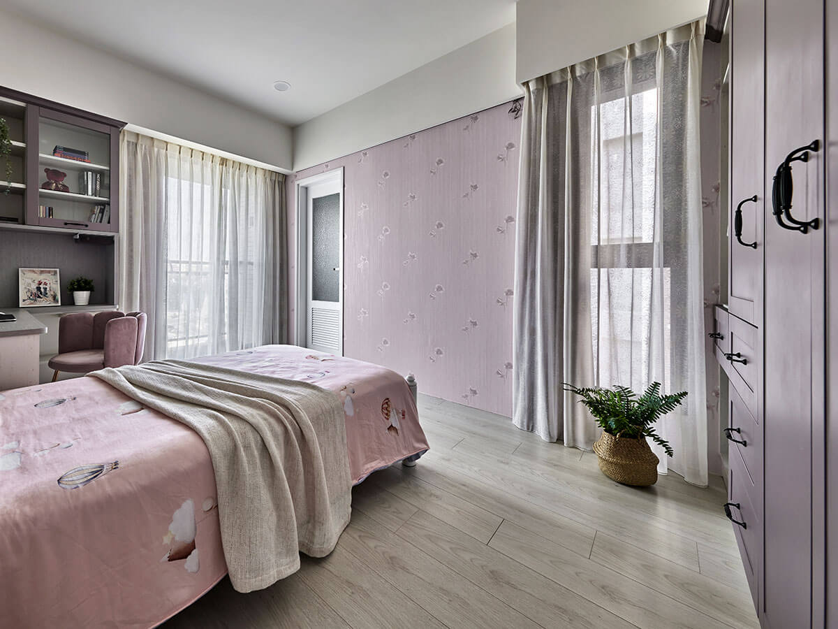 空間風格延續全室柔雅路線,細節上則融入更多女孩喜愛的元素,像是輕柔窗紗、曲線造型吊燈、暖色系木地板等,讓房間多了份浪漫而沉靜的氛圍。綠的傢俱特別善於從屋主家庭的實際需求出發,這間房即採用系統櫃兒童房配置,將衣櫃、展示櫃、開放書架與穿透式窗邊櫃結合,不僅提升收納機能,更讓空間感通透無壓。