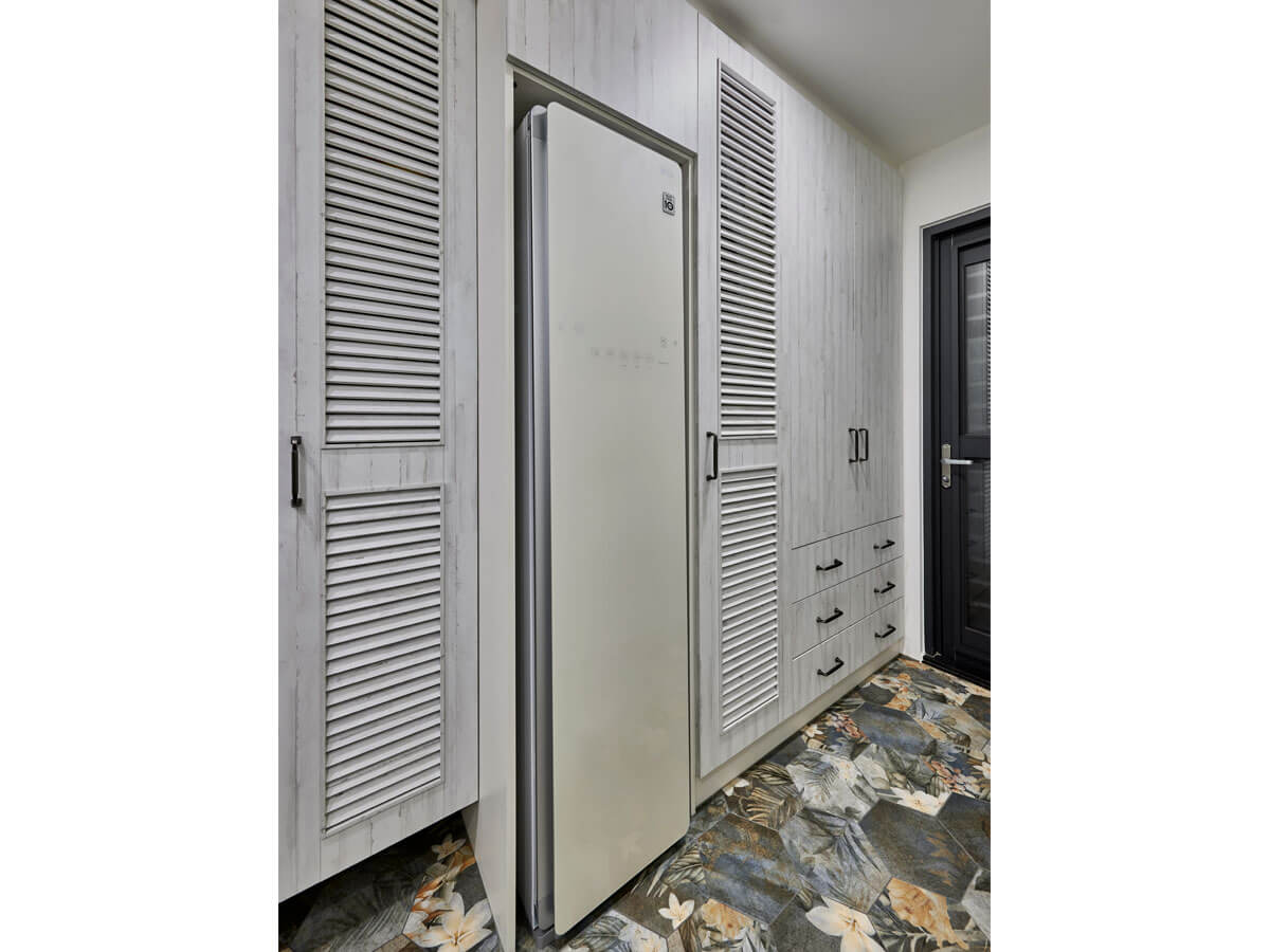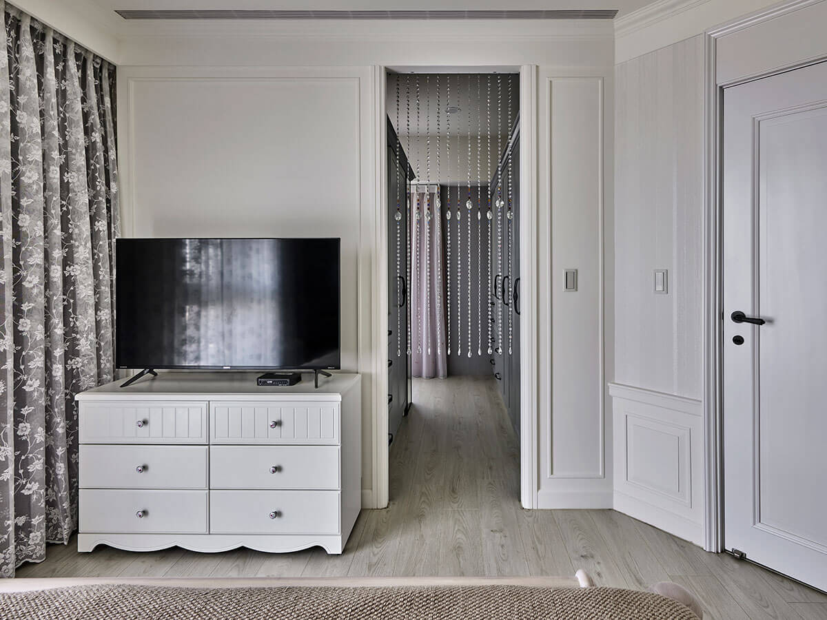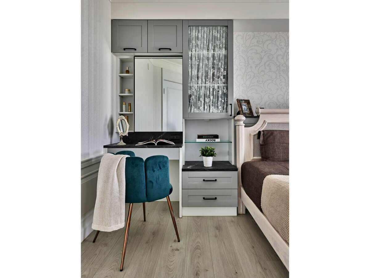 此外,女主人所指定的電子衣櫥也被妥善規劃於櫃體轉角處,不僅預留插座與通風,更透過百葉門板設計提升櫃內空氣流動性,避免潮濕悶熱,達到真正的「收納美學」。地坪則選用具有手感溫度的仿古磚鋪設,進一步延續歐式優雅氛圍。