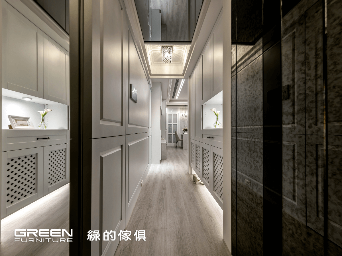 一側的仿古鏡讓人目不暇給,變化多端的紋路與色澤,帶著古典文藝的氣息。黑鏡大剌剌地化身寬版線條,與仿古鏡搖身一變成了典雅的藝術作品。而仿古鏡後,正是不著痕跡的隱藏式衛浴。緊隨在旁的白色霧滑烤漆菱格窗鞋櫃,搭配現代造型的框線,透著濃濃的輕奢風尚。