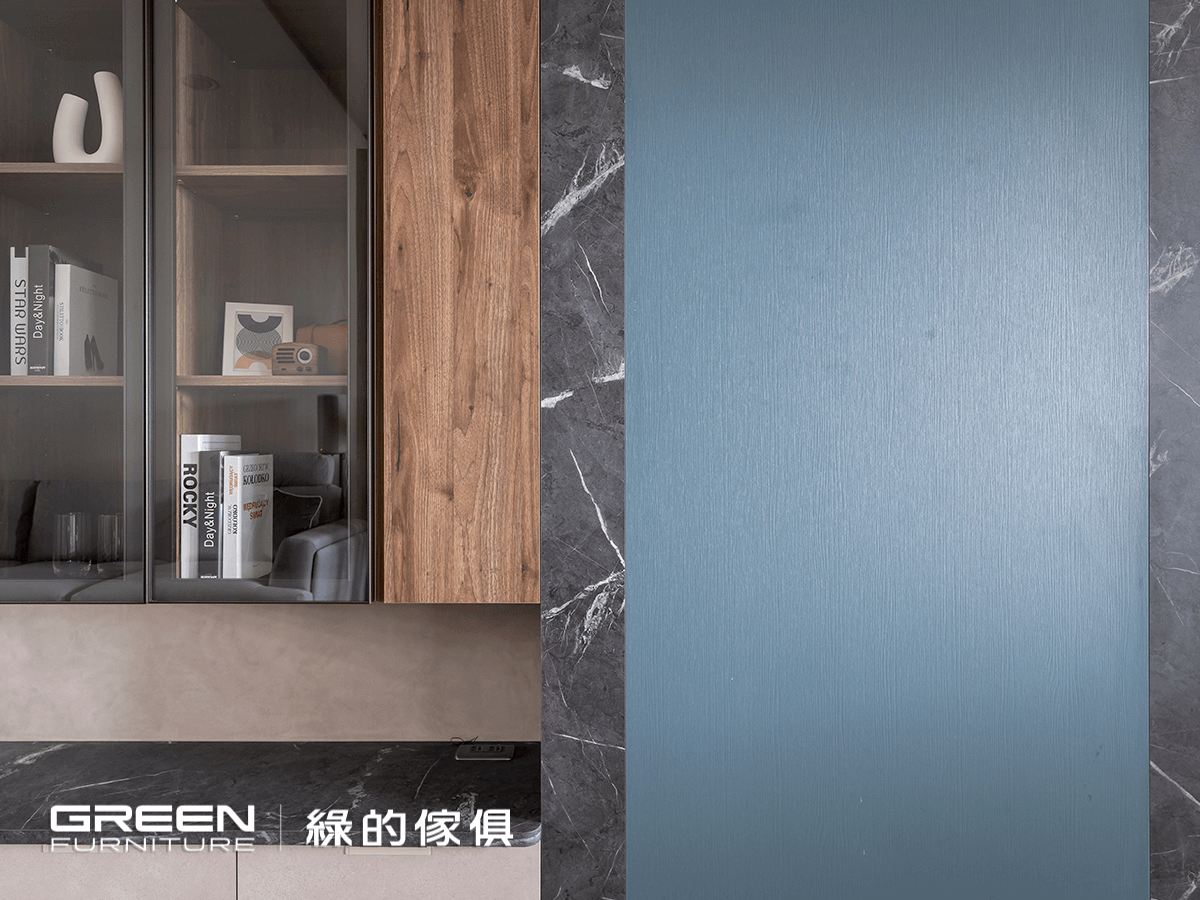 滿版的義大利藝術塗料多變的紋路,豐富了電視牆的層次。黑雲岩面板下方是侘土與胡桃木組成的電視櫃,一側的玻璃吊櫃則沿襲胡桃木的元素,緊鄰的裝飾壁板也在波布藍與黑雲岩的搭檔下,為空間帶來更多和諧與平衡。