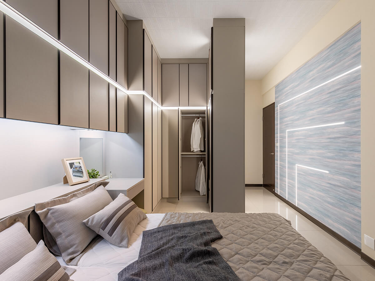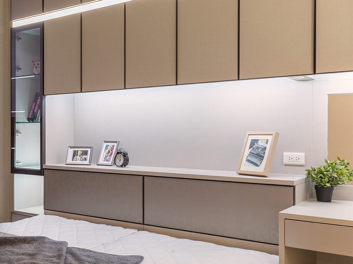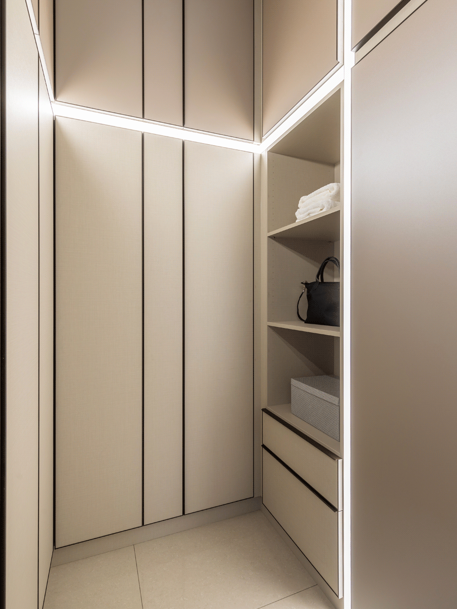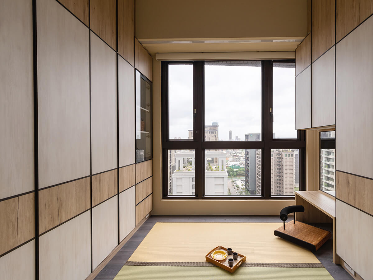 緊鄰書房的空間,是坐落在左右牆面的頂天櫃體,以更衣間為主要功能,配合梳妝台的收納,讓衣物有更隱私的收納空間;沙橡所圍成的腰邊,成功從空間切分出和諧的比例,配合嵌入地面的塌塌米、更增添了溫暖的氛圍、提供了三五好友休憩聊天的場所,更可以做為客房使用。